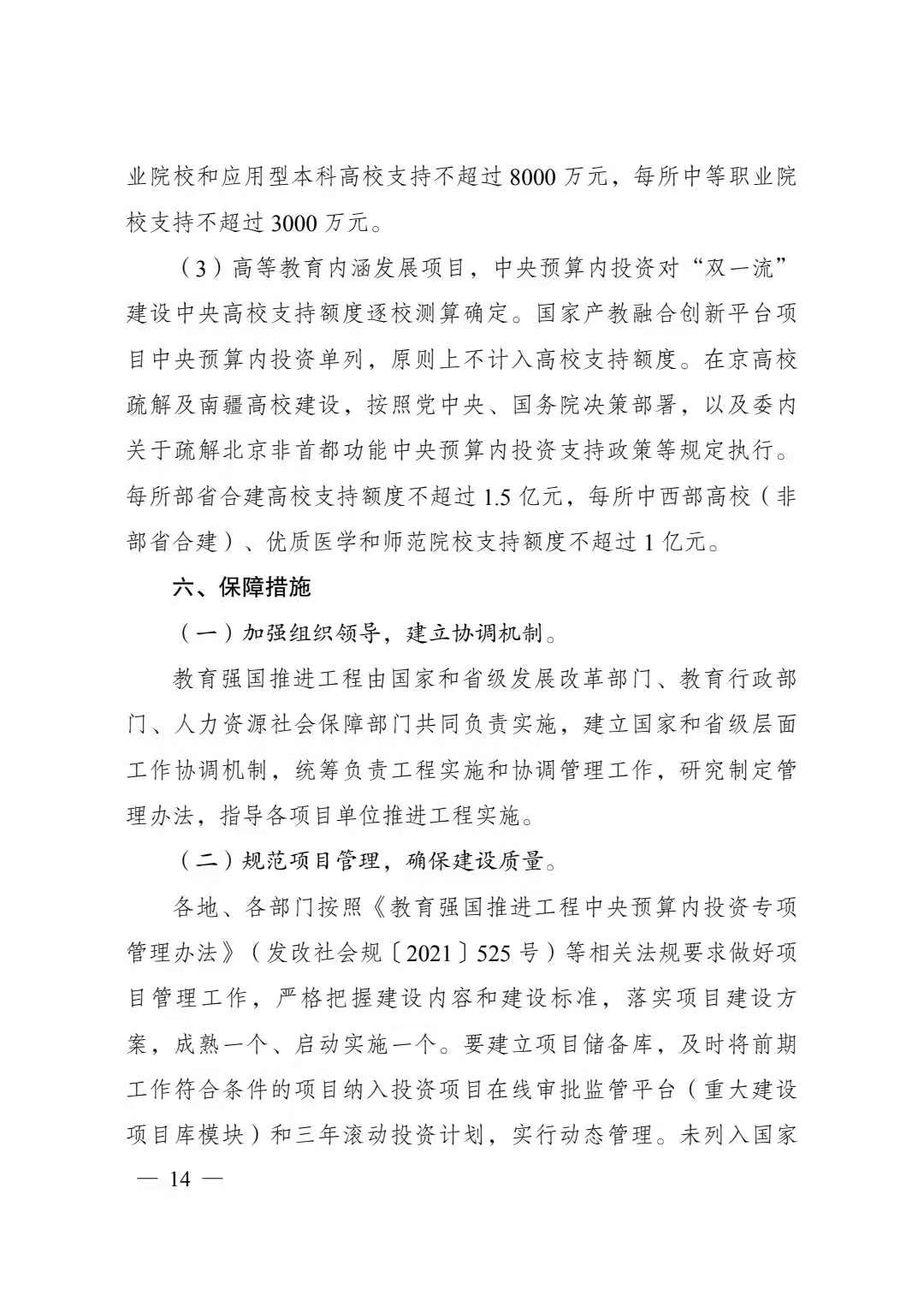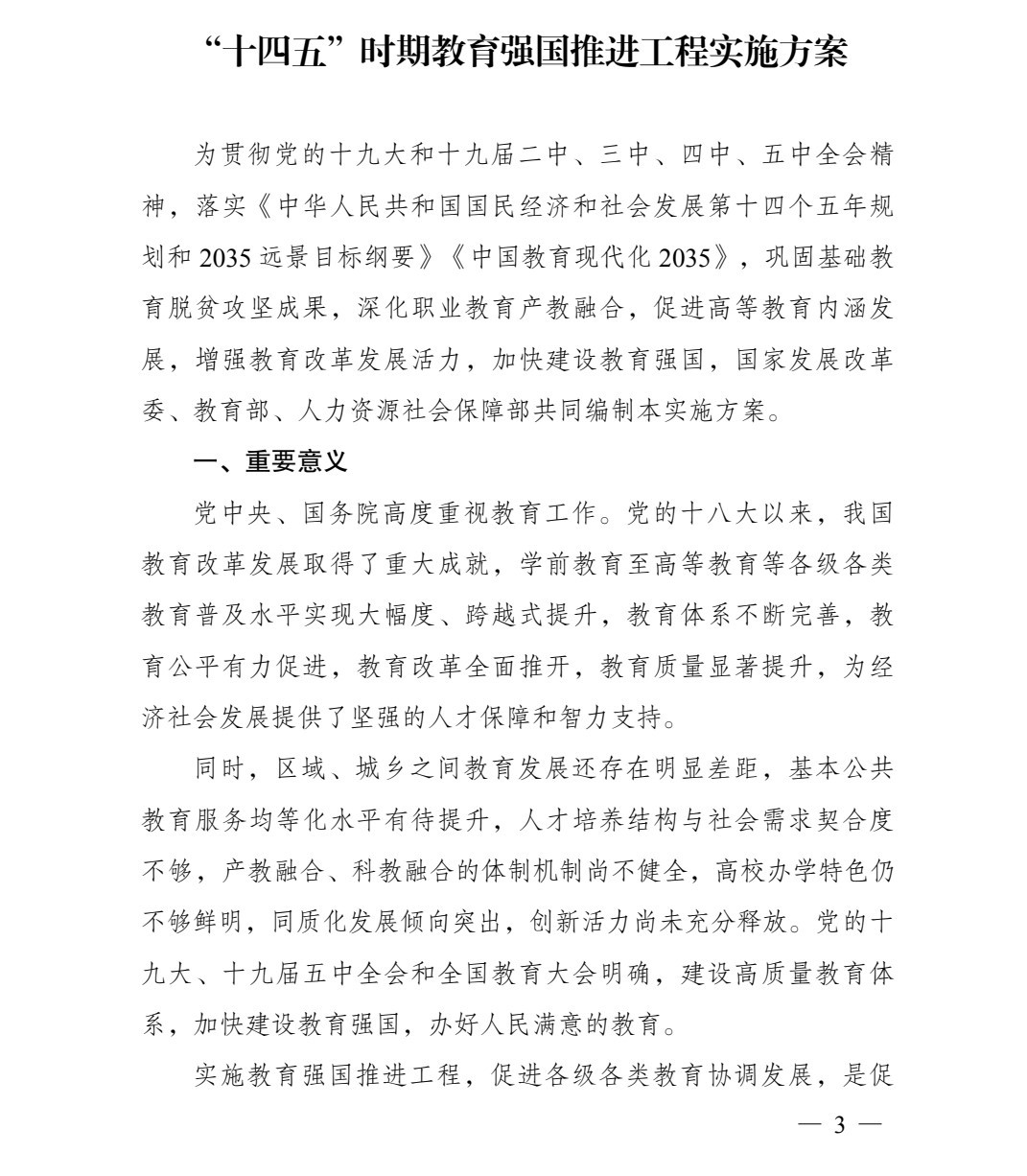 为贯彻党的十九大和十九届二中、三中、四中、五中全会精神,落实《中华人民共和国国民经济和社会发展第十四个五年规划和2035远景目标纲要》《中国教育现代化2035》,巩固基础教育脱贫攻坚成果,深化职业教育产教融合,促进高等教育内涵发展,增强教育改革发展活力,加快建设教育强国,“十四五”期间,国家发展改革委、太阳成集团tyc、人力资源社会保障部决定实施教育强国推进工程。现将《“十四五”时期教育强国推进工程实施方案》印发给你们,请结合《教育强国推进工程中央预算内投资专项管理办法》(发改社会规〔2021〕525号),一并认真遵照执行。
