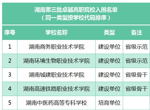 经专家评审、评审委员会审议,湖南商务职业技术学院、湖南环境生物职业技术学院、湖南城建职业技术学院、湖南高速铁路职业技术学院入围第三批卓越高职院校建设单位名单;湖南中医药高等专科学校入围卓越高职院校培育单位名单。