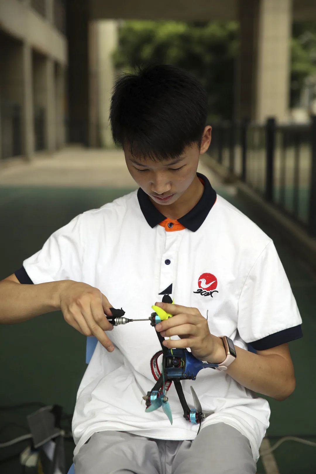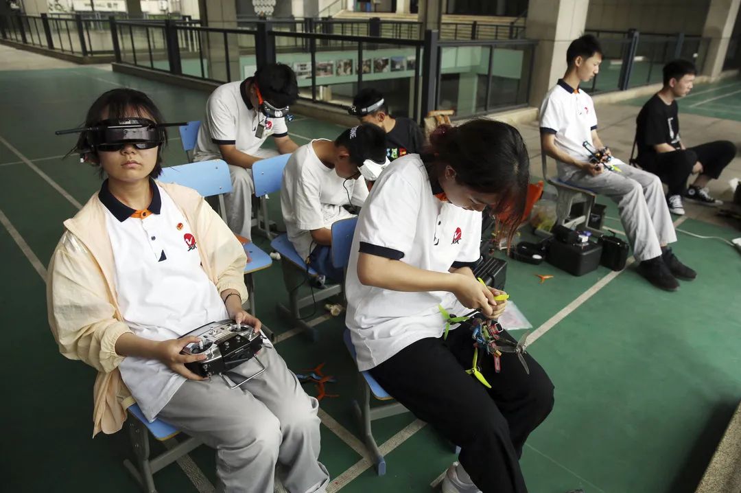 中策职业学校的电气运行与控制专业有一个专业方向是“无人机”。图为学生由教练带领在校园里试飞(于楚众 摄)