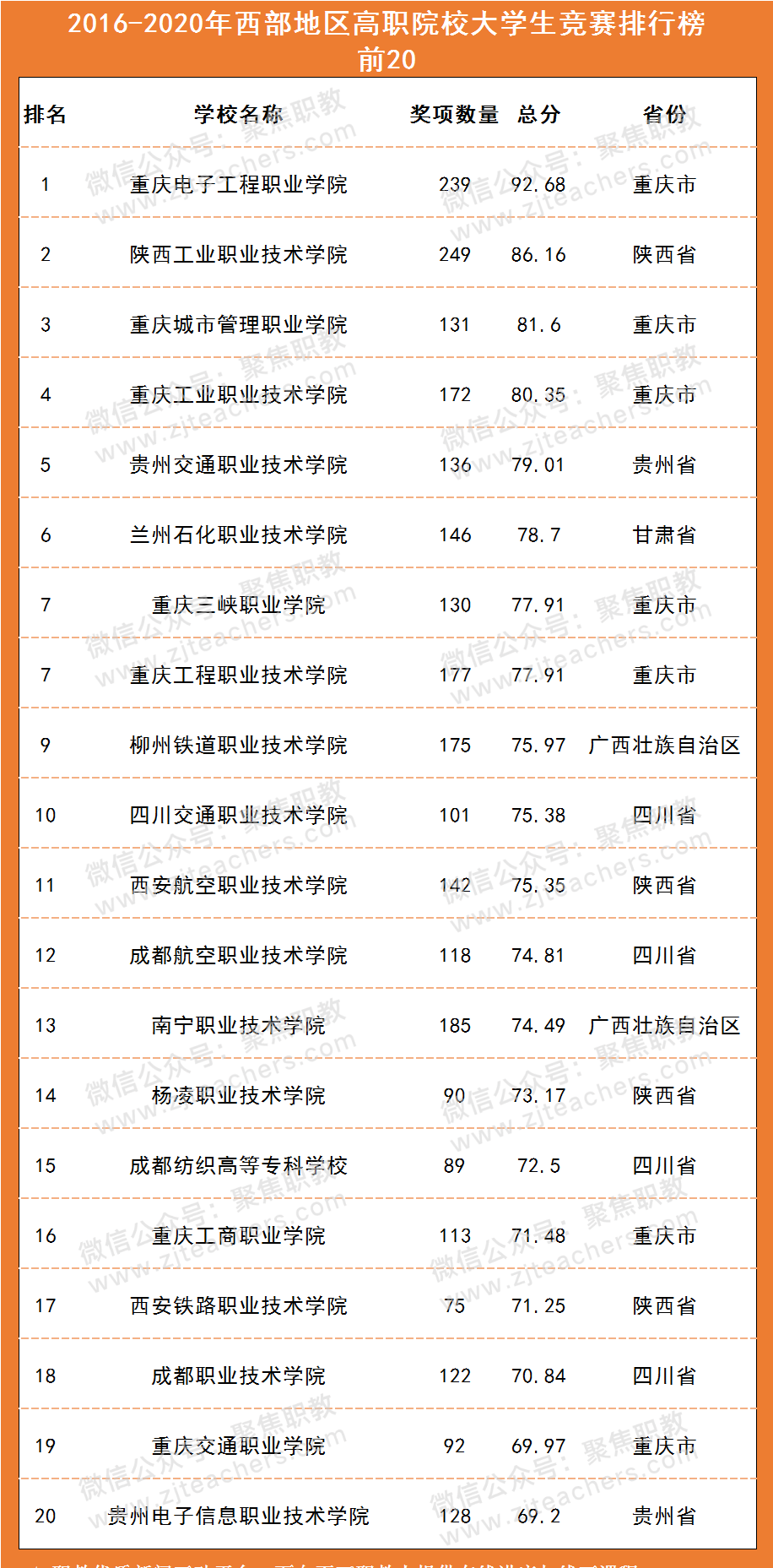 2016-2020年西部地区高职院校大学生竞赛排行榜(前20)