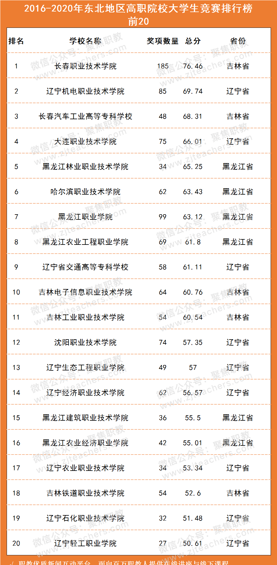 2016-2020年东北地区高职院校大学生竞赛排行榜(前20)