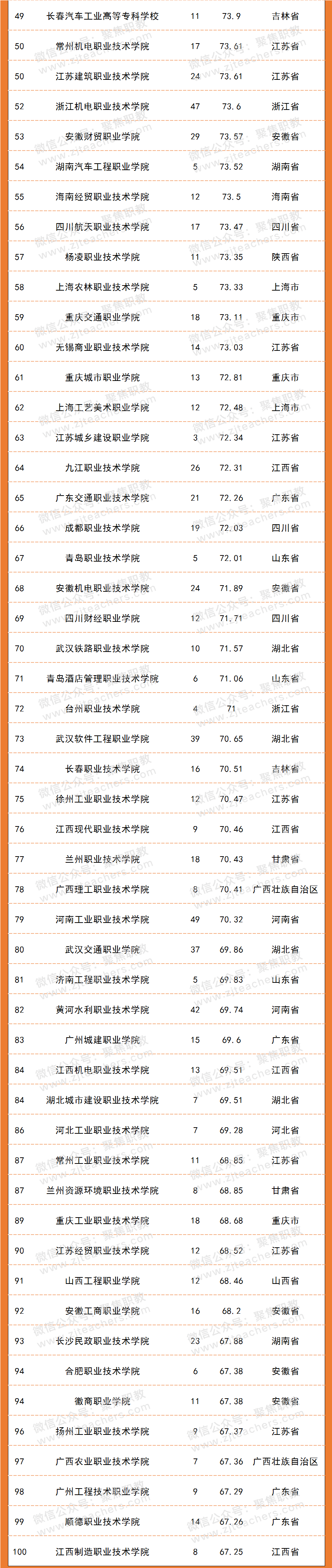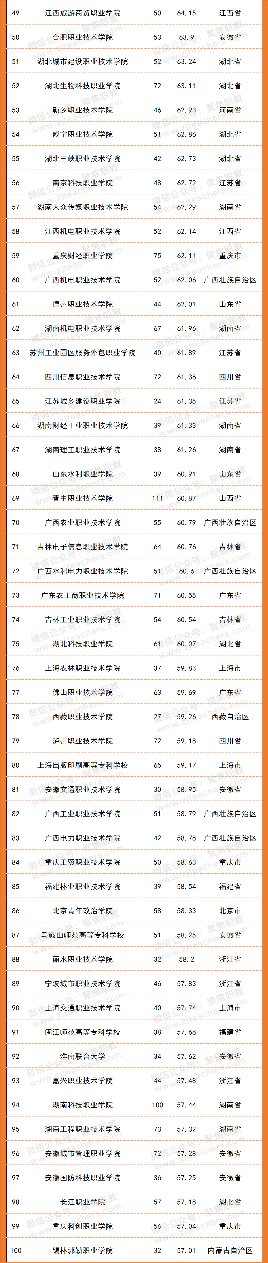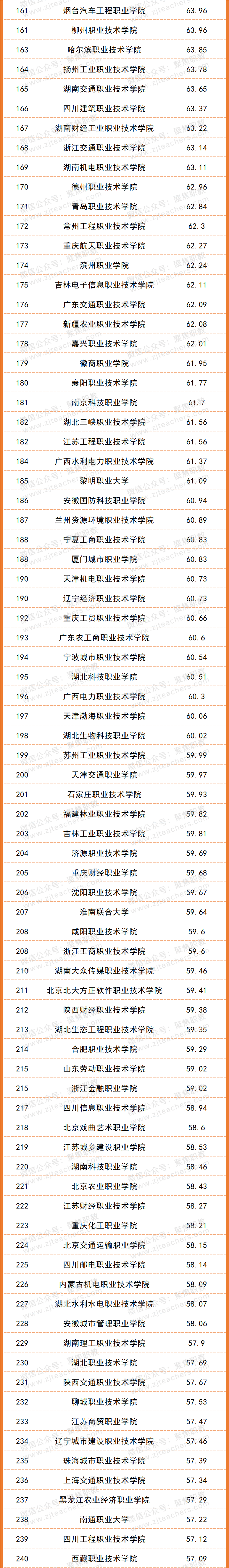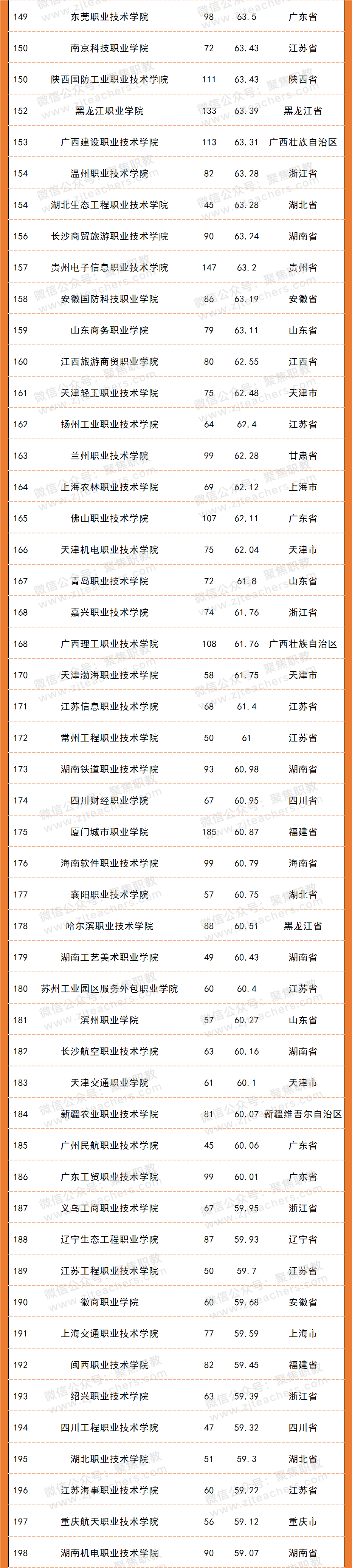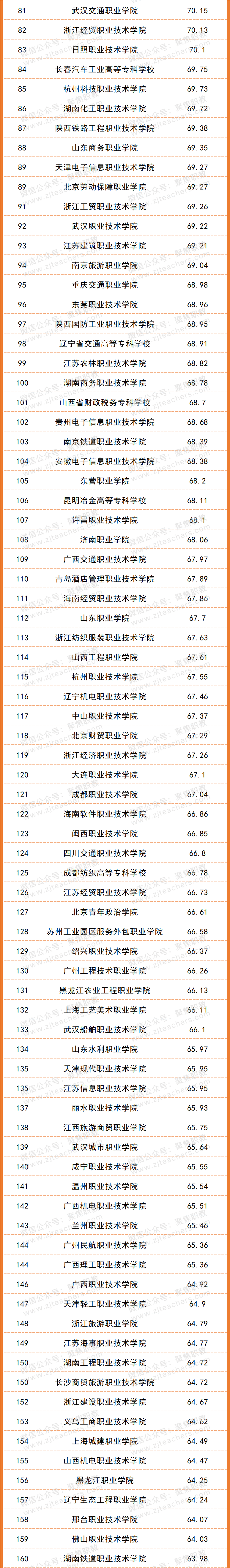 据统计,五轮总榜单(高职)中,金华职业技术学院位列榜首、北京工业职业技术学院和北京电子科技职业学院分列第二名和第三名。2016-2020年榜单(高职)共列入全国1071所高职院校,金华职业技术学院位列榜首,重庆电子工程职业学院和深圳职业技术学院分别位居第二名和第三名,第四到第十名分别是芜湖职业技术学院、山东商业职业技术学院、福建信息职业技术学院、长沙民政职业技术学院、江西环境工程职业学院、江西应用技术职业学院、陕西工业职业技术学院。