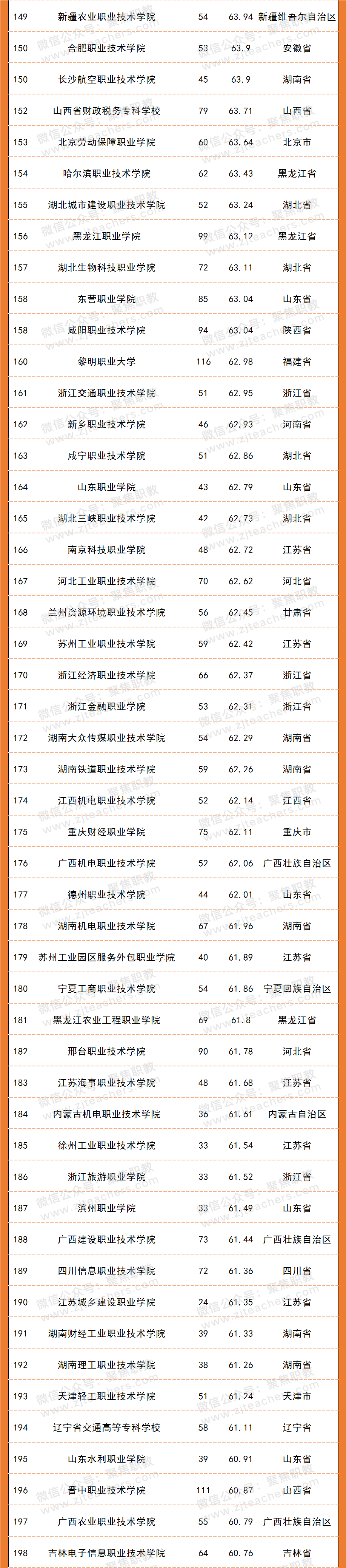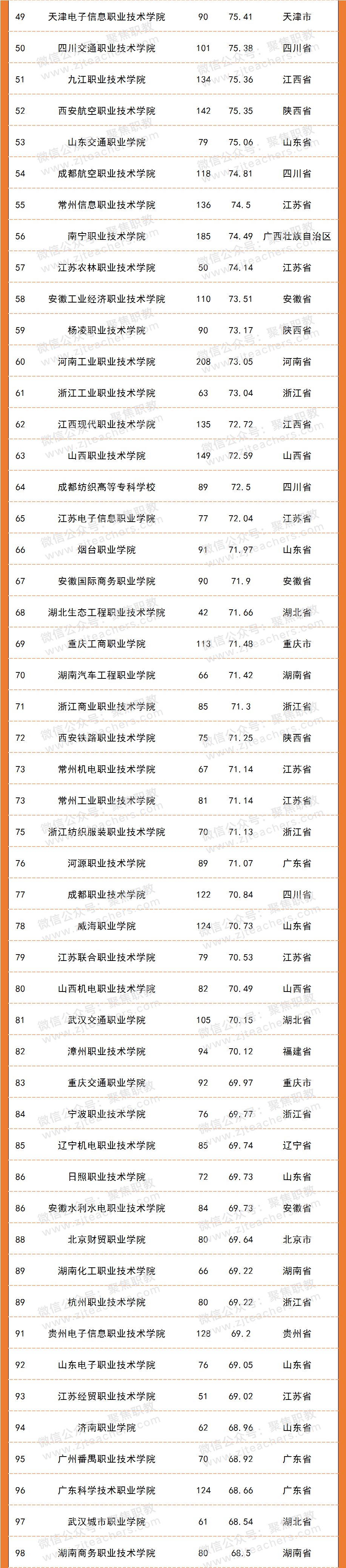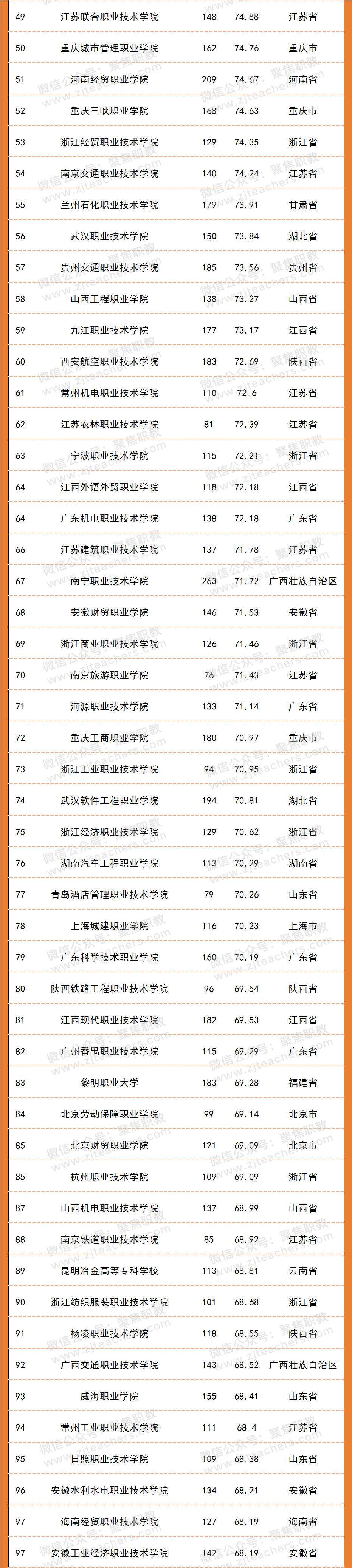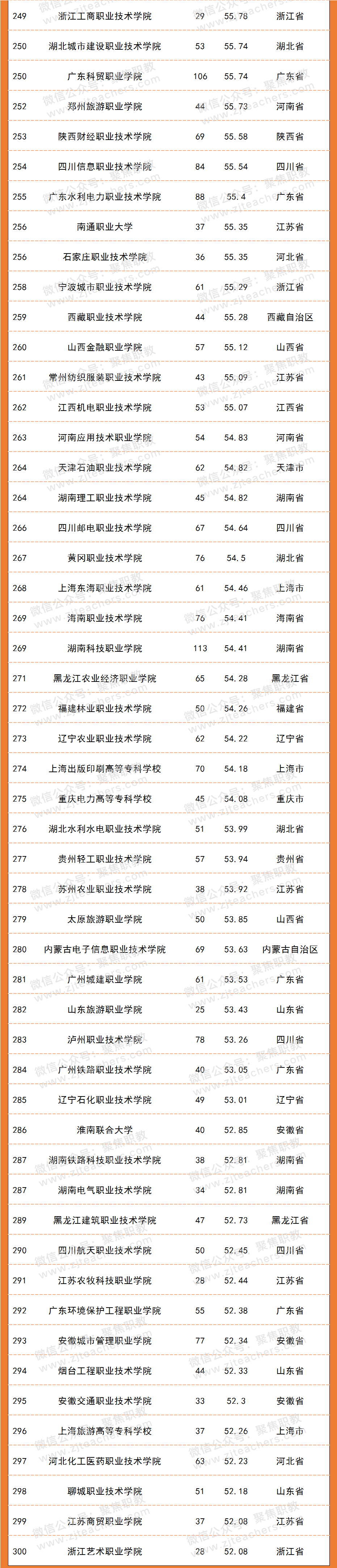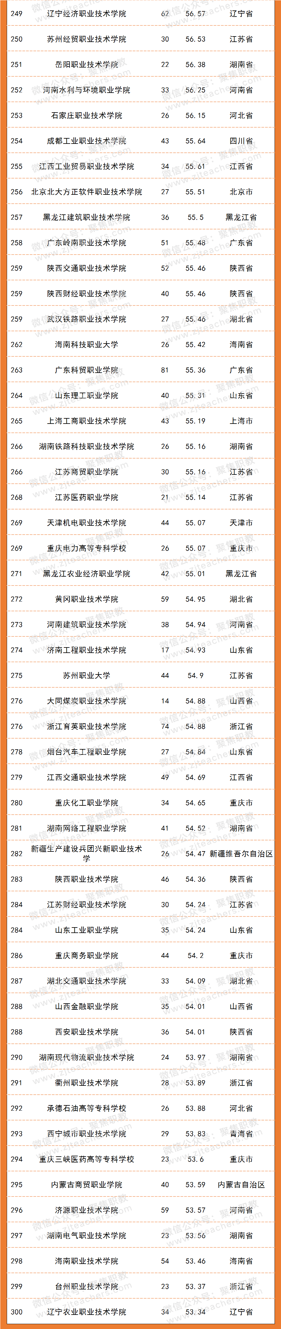 据统计,五轮总榜单(高职)中,金华职业技术学院位列榜首、北京工业职业技术学院和北京电子科技职业学院分列第二名和第三名。2016-2020年榜单(高职)共列入全国1071所高职院校,金华职业技术学院位列榜首,重庆电子工程职业学院和深圳职业技术学院分别位居第二名和第三名,第四到第十名分别是芜湖职业技术学院、山东商业职业技术学院、福建信息职业技术学院、长沙民政职业技术学院、江西环境工程职业学院、江西应用技术职业学院、陕西工业职业技术学院。