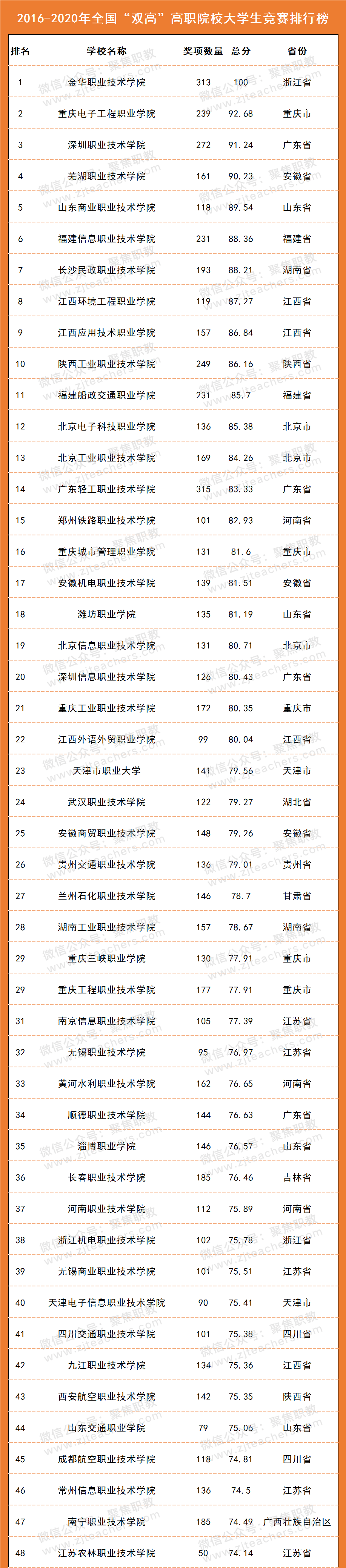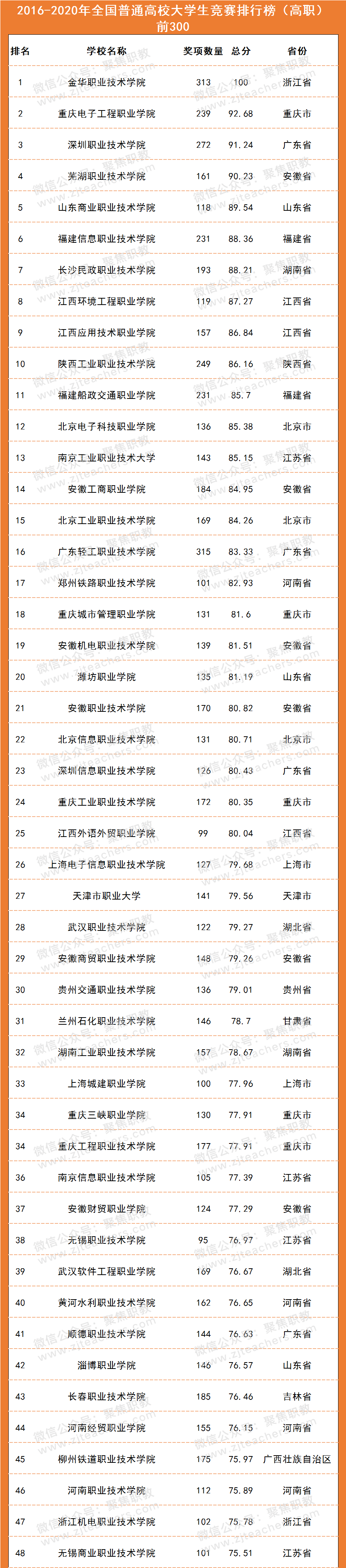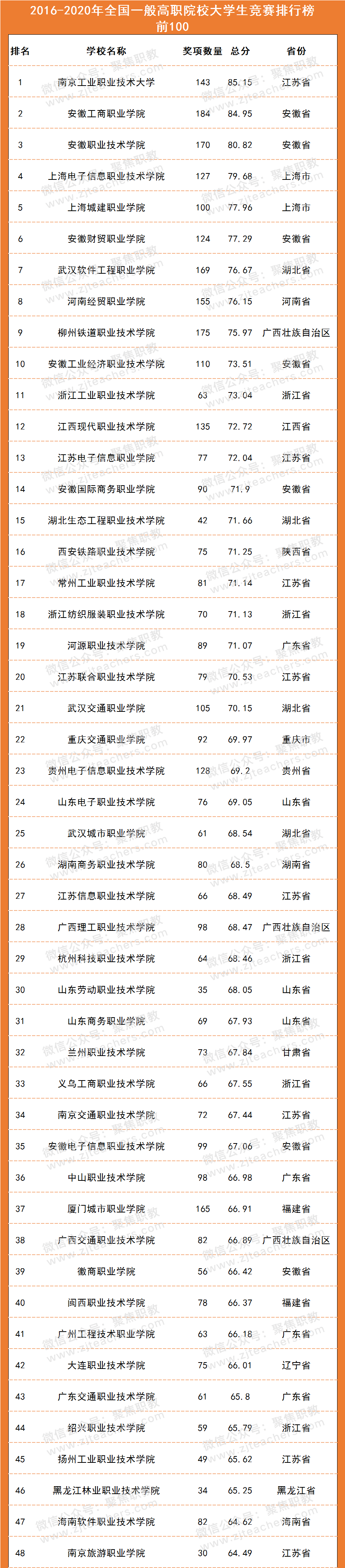 2016-2020年全国一般高职院校大学生竞赛排行榜(前100)
