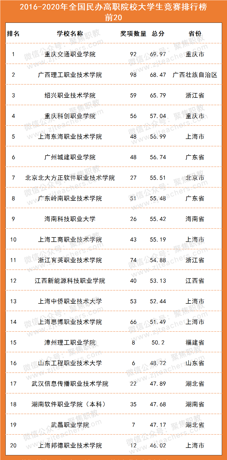2016-2020年全国民办高职院校大学生竞赛排行榜(前20)