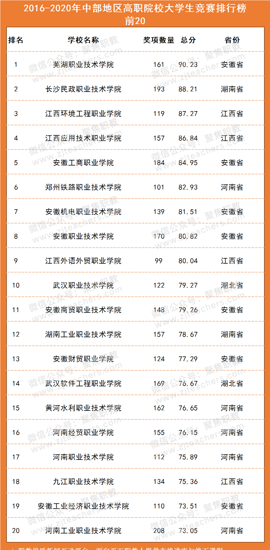 2016-2020年中部地区高职院校大学生竞赛排行榜(前20)
