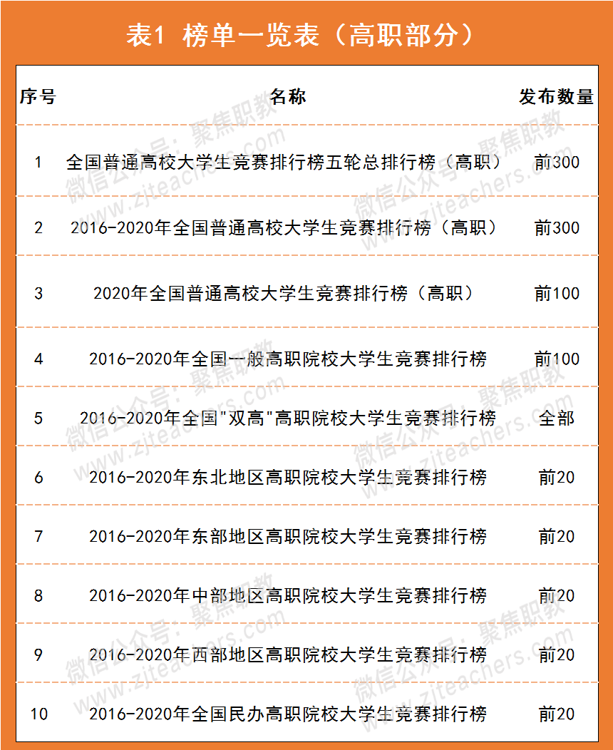2021年3月22日,中国高等教育学会高校竞赛评估与管理体系研究工作组发布2020全国普通高校大学生竞赛排行榜,其中包含高职院校榜单10个。