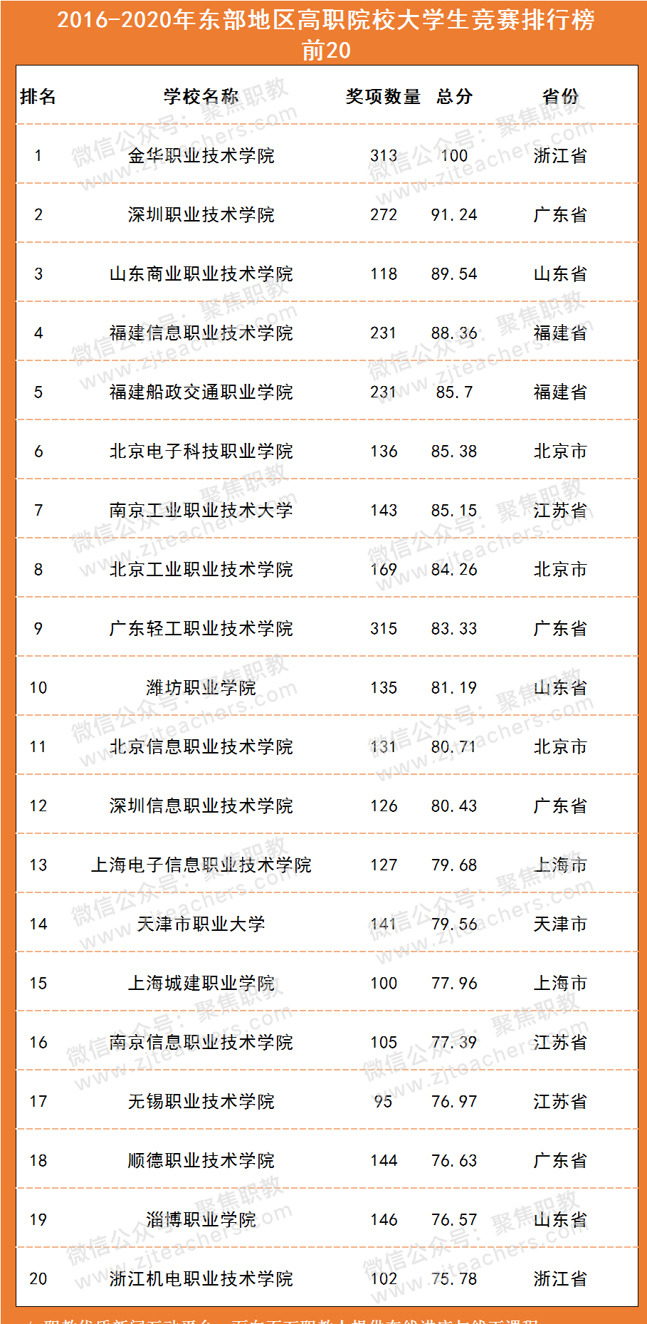 2016-2020年东部地区高职院校大学生竞赛排行榜(前20)