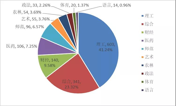 从类型分布(图1)来看,高职院校分为理工、综合、财经、医药等11种类型,1466所高职高专院校中理工、综合、财经类高校比例较高,各有603、341和140所,分别占总数的41.24%、23.32%和9.58%,三大类型占比超过70%,和往年变化不大。