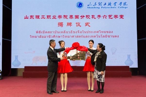 山东省教育厅国际交流与合作处江雨处长、泰国曼谷职业教育中心冲普努•波邦松主任为山东理工职业学院泰国分校-孔子六艺学堂揭牌