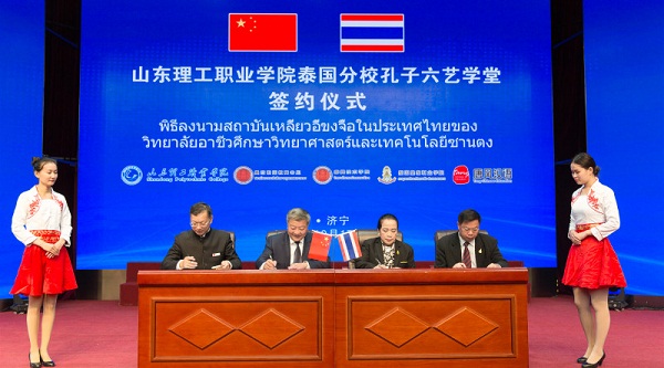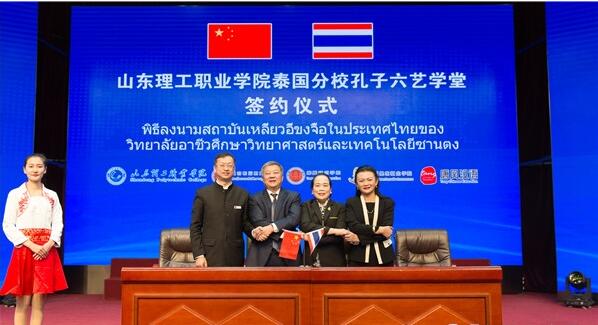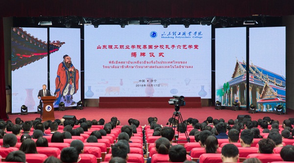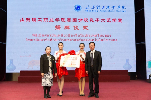 10月17日,山东理工职业学院泰国分校-孔子六艺学堂揭牌仪式顺利举行。该分校与泰国曼谷职业教育中心、泰国皇家制金学院、泰国廊曼技术学院、唐风汉语教育科技有限公司合作共建,以孔子六艺学堂为载体,按照“汉语+文化+专业+产业”模式设计,以“互联网+国际职业教育”方式开展学历教育与职业培训,把中国优秀职业教育成果输出到泰国,服务走出去的中资企业,助力中泰产能合作,培养适合“一带一路”建设需要的技术技能型人才。