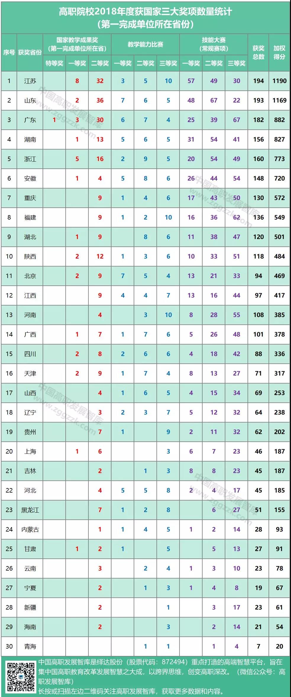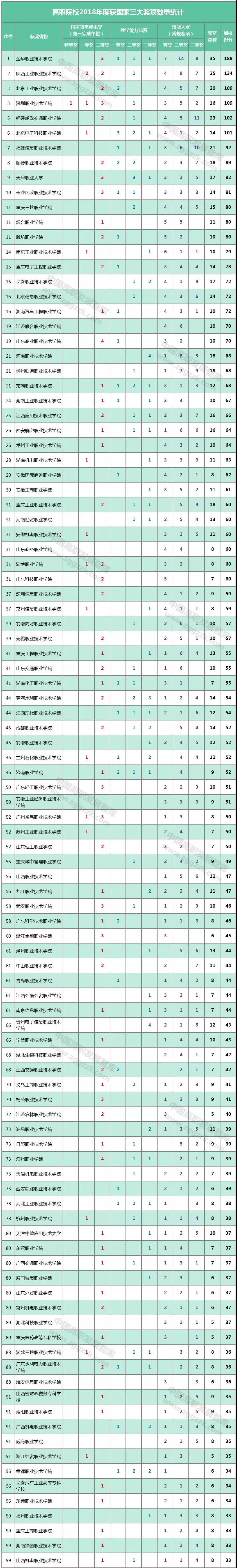 今天,高职发展智库对2018年这三大重量级奖项进行盘点,从各维度进行统计。对各大高职院校来说,这三大奖项基本代表了过去一年学校在教学改革、教学能力、人才培养质量取得的成绩,也是学校过去一年的一个成绩单。