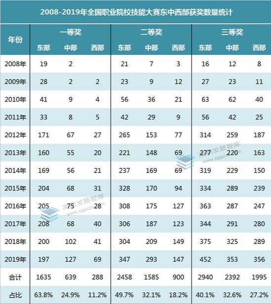根据历年全国职业院校技能大赛获奖名单统计,东部获奖总数明显高于中西部。2008年至2019年,东部、中部、西部获奖总数分别为7033项、4616项、3183项,东部获奖总数约为中部的1.5倍,西部的2.2倍。而一等奖东部优势更加明显,东部、中部、西部一等奖获奖总数分别为1635项、639项、288项,东部一等奖获奖总数约为中部的2.6倍,西部的5.7倍。