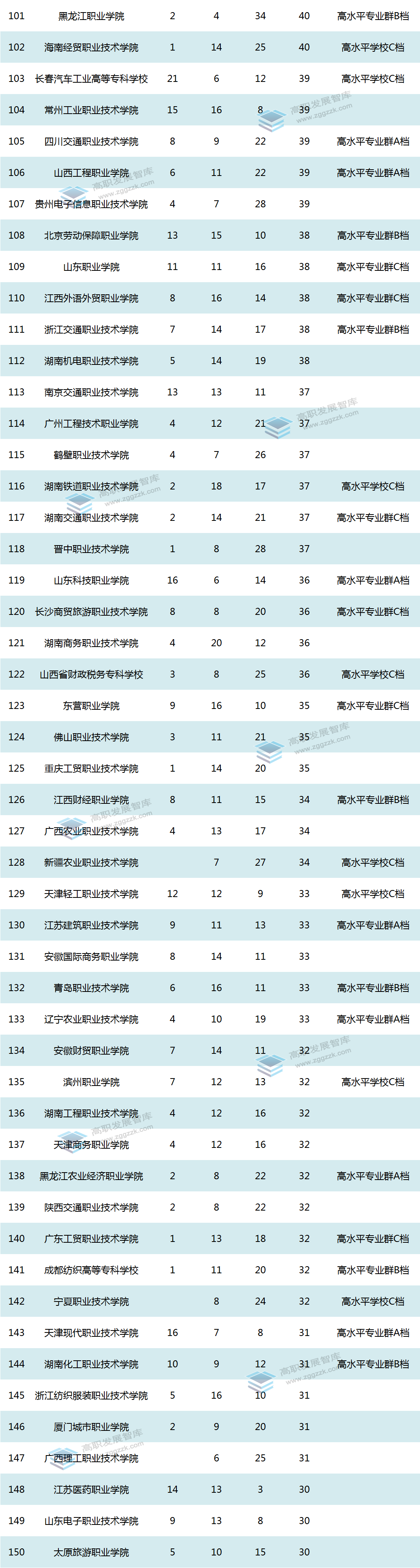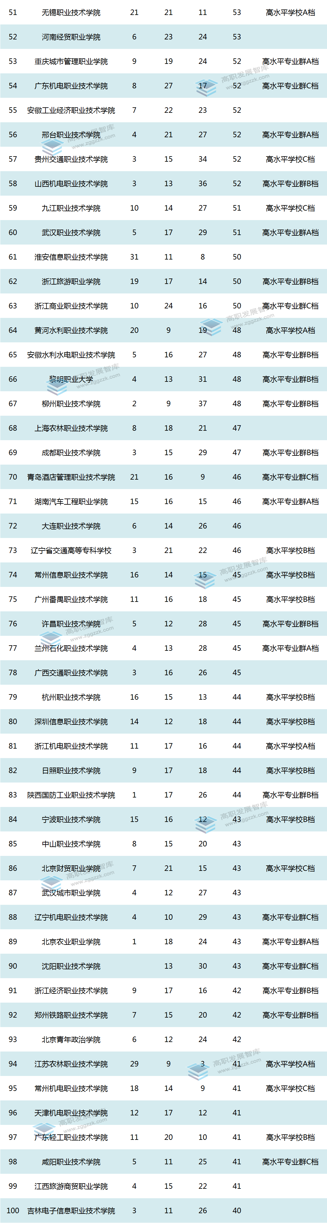 总获奖数在100项以上的高职院校还有安徽工商职业学院、福建船政交通职业学院、顺德职业技术学院、柳州铁道职业技术学院、北京电子科技职业学院、福建信息职业技术学院、重庆工业职业技术学院、陕西工业职业技术学院、天津职业大学、漳州职业技术学院和河南职业技术学院。