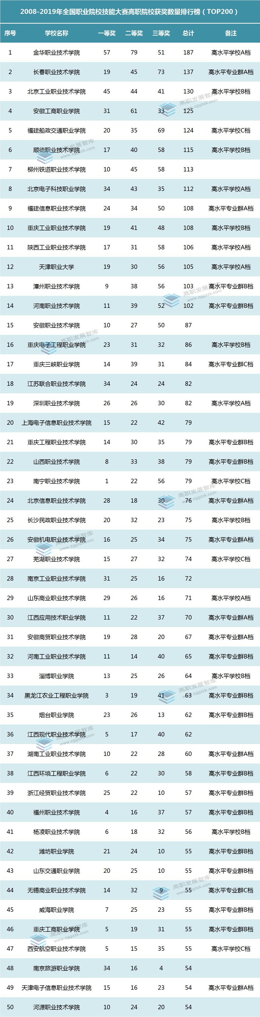本期高职发展智库统计并分析,历年(2008-2019年)全国职业院校技能大赛高职院校获奖情况,供大家参考。