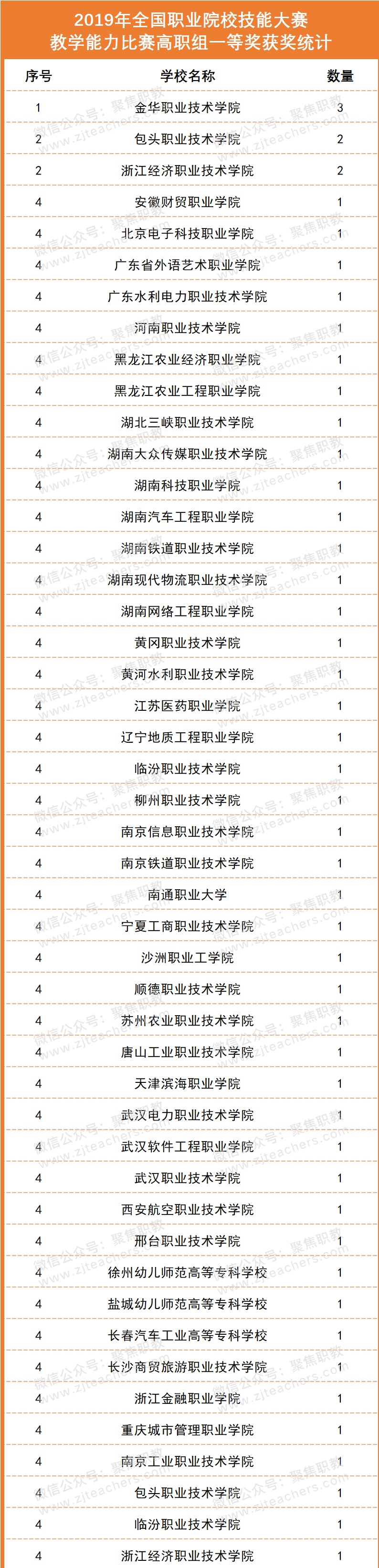 2019年度共有47所职业院校获得一等奖。其中,金华职业技术学院获得3项一等奖;包头职业技术学院、浙江经济职业技术学院分别获得2项一等奖;北京电子科技职业学院、宁夏工商职业技术学院、武汉职业技术学院、邢台职业技术学院、安徽财贸职业学院等39所职校分别获1项一等奖。