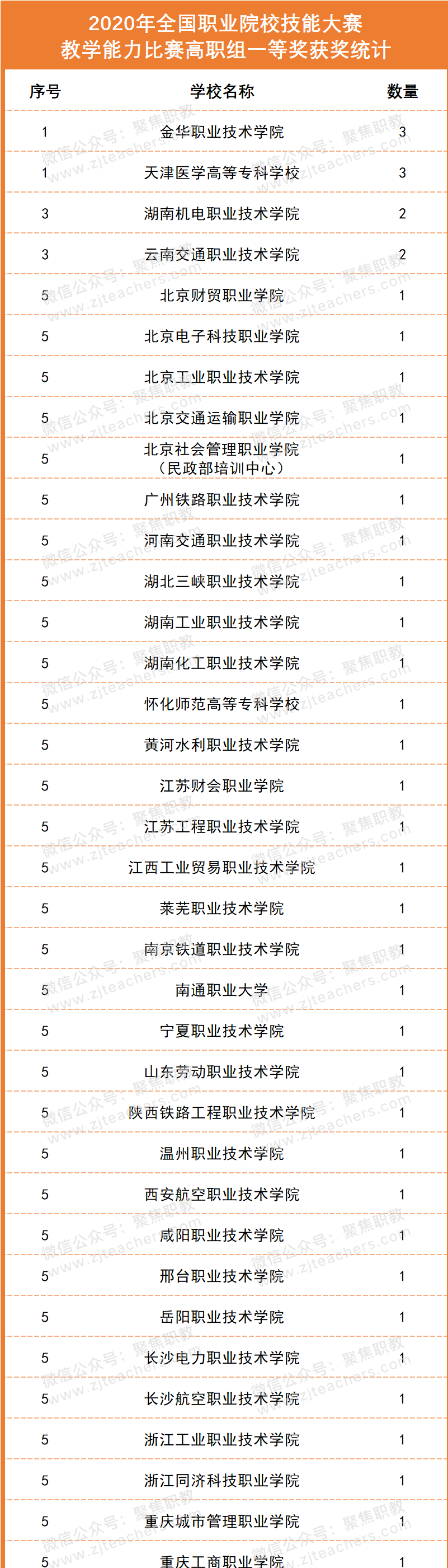2020年度共有36所职业院校获一等奖。天津医学高等专科学校、金华职业技术学院分别获得3项一等奖;湖南机电职业技术学院和云南交通职业技术学院获得2项一等奖;黄河水利职业技术学院、邢台职业技术学院、西安航空职业技术学院、北京财贸职业学院、湖南化工职业技术学院等34所职校分别获1项一等奖。