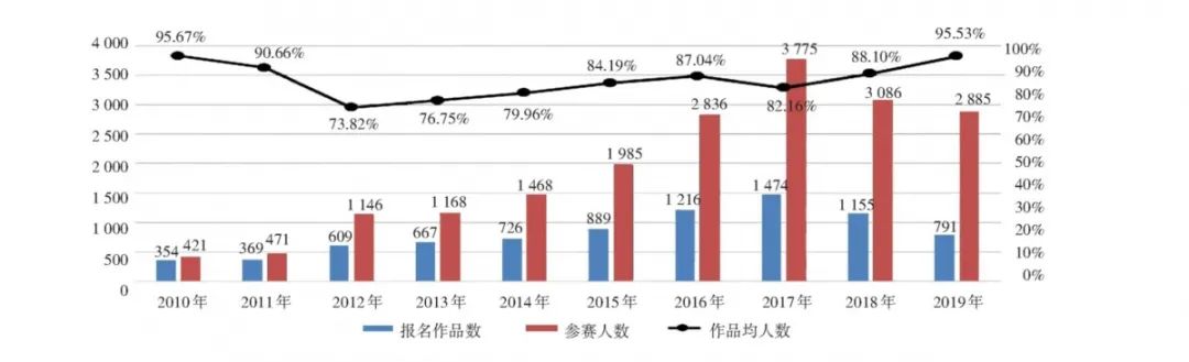 2010年,全国只有421名教师参加,之后规模逐年增加。2017年,3775名教师参赛,达到最高值,目前稳定在3000人左右。在参赛作品方面,也由2010年的354个攀升至2017年的1474个。2019年,大赛实施新方案,参赛方式限定于团队比赛,因此作品总数回落至791个,其中中职组提交作品424个,高职组提交367个,基本实现中高职参赛规模的均衡。