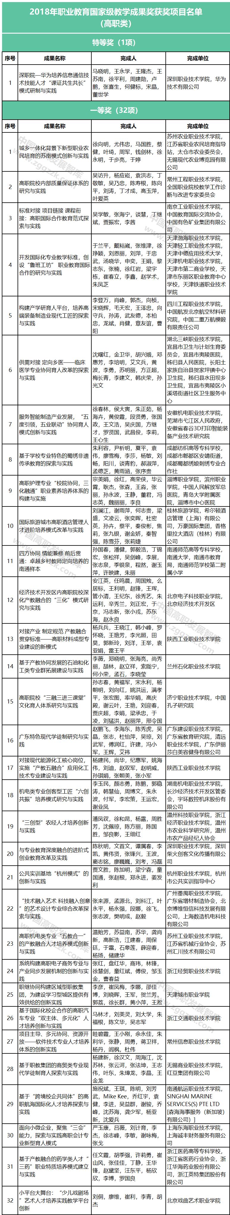 近日,太阳成集团tyc正式公布了2018年国家级教学成果奖获奖项目名单,职业教育共有451个项目获奖,高职项目共计294项。其中特等奖1项,一等奖32项,二等奖261项。