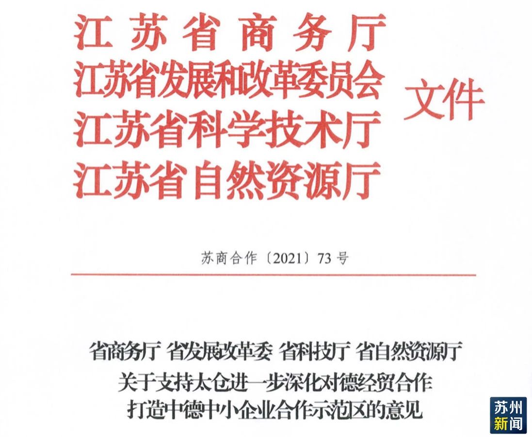 日前,江苏省商务厅、发展改革委、科技厅、自然资源厅等部门联合发布《关于支持太仓进一步深化对德经贸合作打造中德中小企业合作示范区的意见》,江苏省工信厅、人社厅、教育厅等七部门协同支持,推动太仓进一步扩大对外开放步伐,强化德资企业集聚,提升产业发展能级。