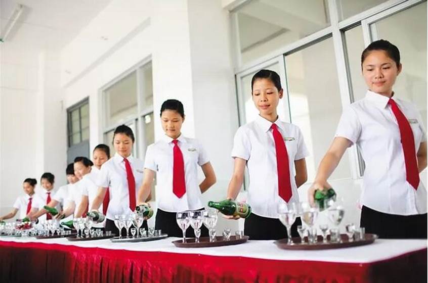 在海南省旅游学校,学生进行倒酒操作演示 张茂摄