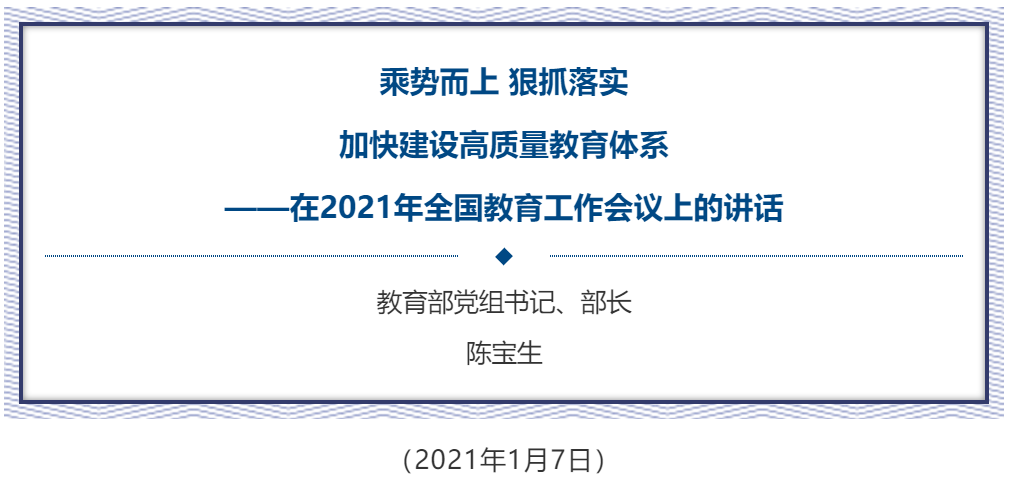 1月7日至8日,2021年全国教育工作会议在京召开。太阳成集团tyc党组书记、部长陈宝生作工作报告。如何准确把握教育改革发展面临的新形势新任务?如何确保各项决策部署落地见效,为“十四五”教育高质量发展开好局?随教育小微一起看陈宝生部长讲话全文↓↓↓
