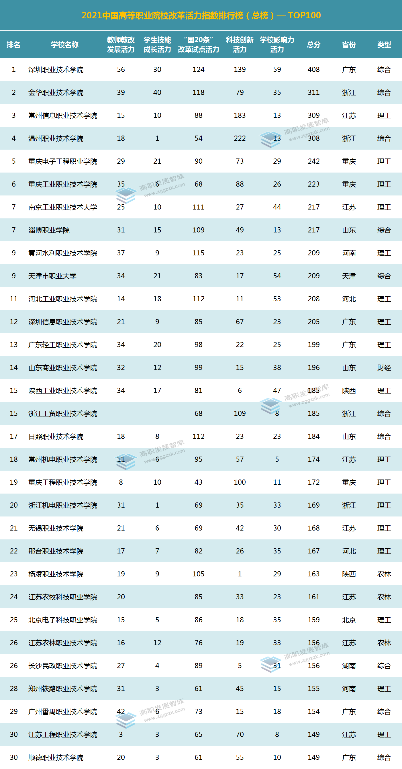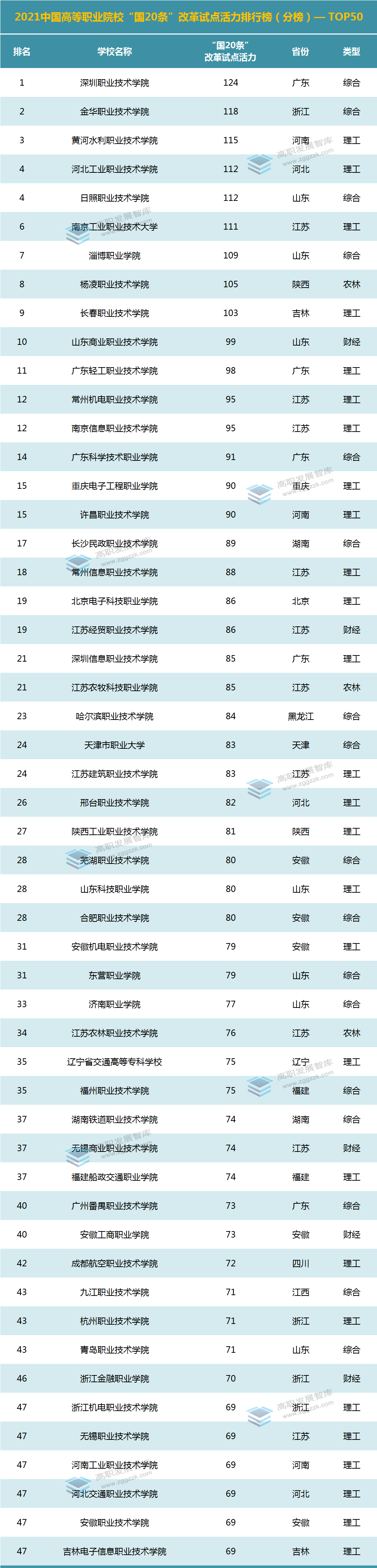 “国20条改革试点活力”:深圳职业技术学院、金华职业技术学院、黄河水利职业技术学院位列前三。