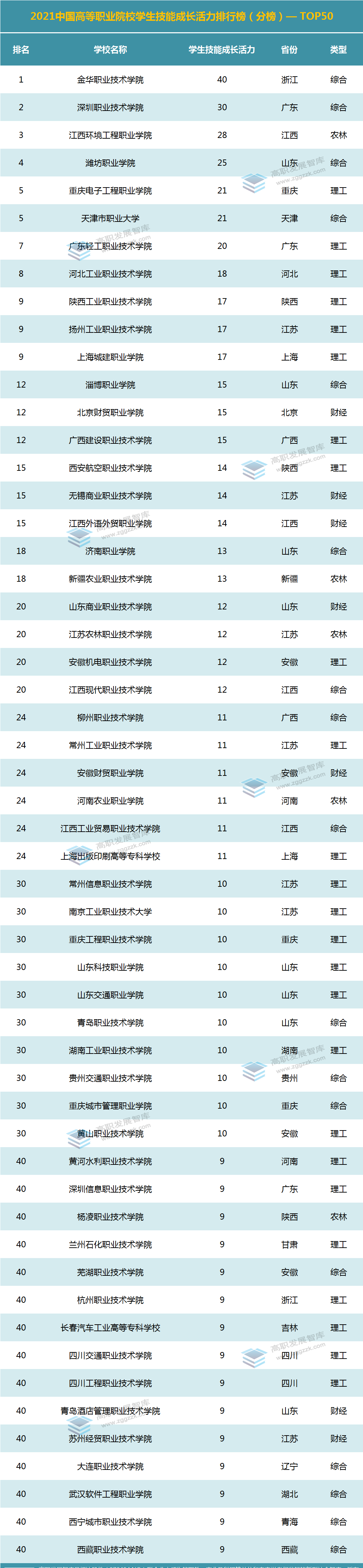 “学生技能成长活力”:金华职业技术学院、深圳职业技术学院、江西环境工程职业学院位列前三。