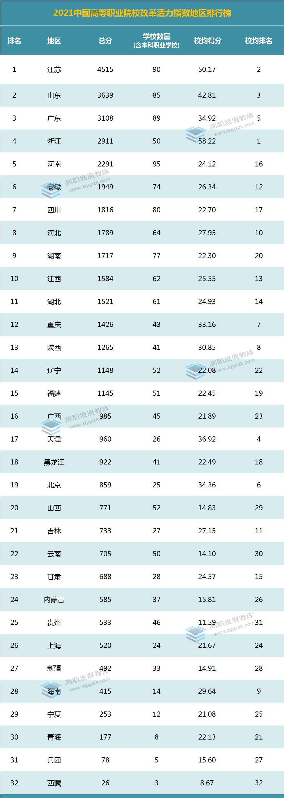 从改革活力指数地区排行榜来看,江苏、山东、广东延续去年优势,稳居前三位;从校均得分来看,浙江、江苏、山东、天津、广东等省高等职业院校平均实力较强。