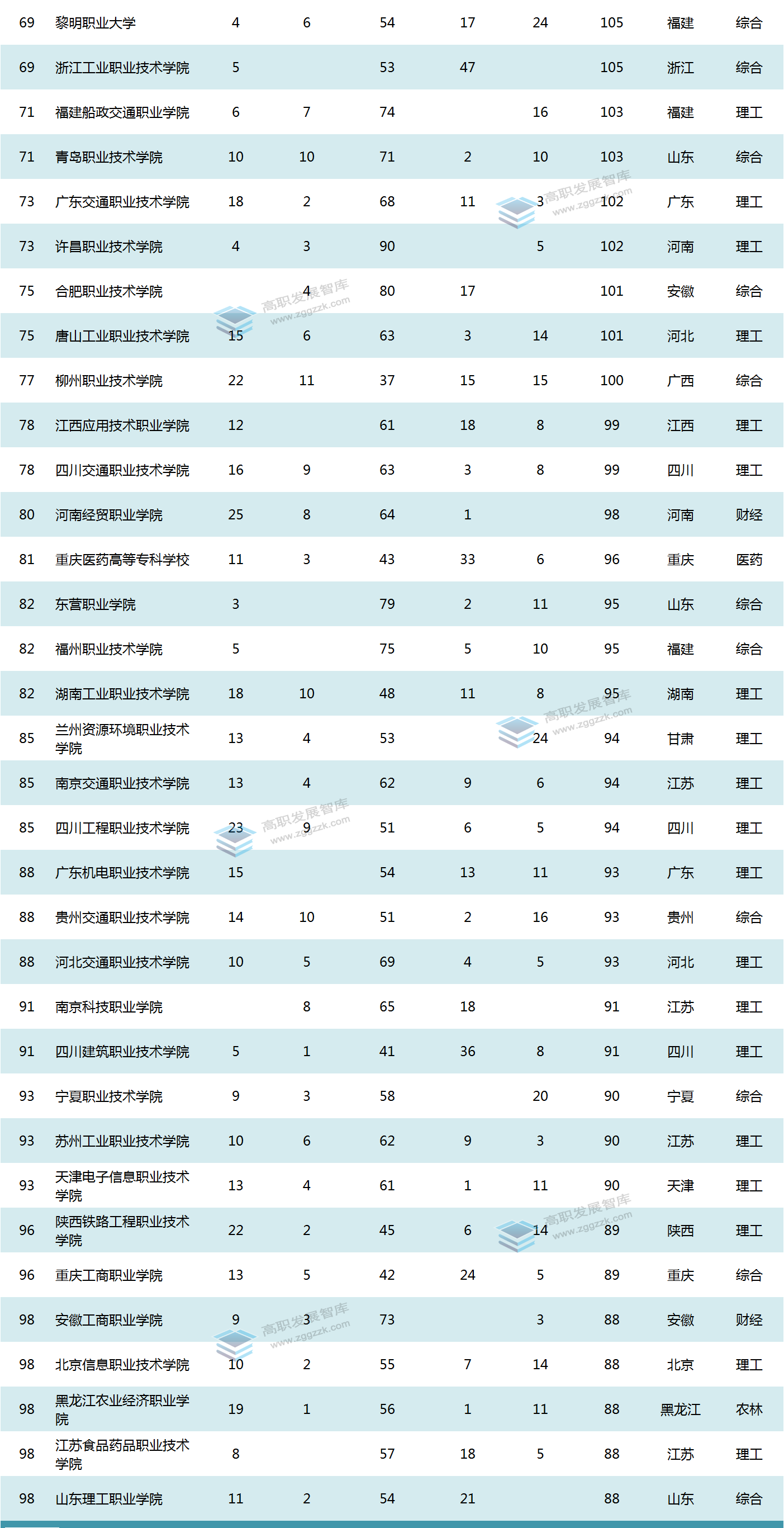 总榜百强中,东部院校60所,中部院校22所,西部院校20所。以江苏(18所)、山东(12所)、广东(8所)、浙江(8所)为代表的东部及沿海地区依旧是全国高等职业教育改革的最前沿,改革力度大,改革成绩突出且远优于中西部。