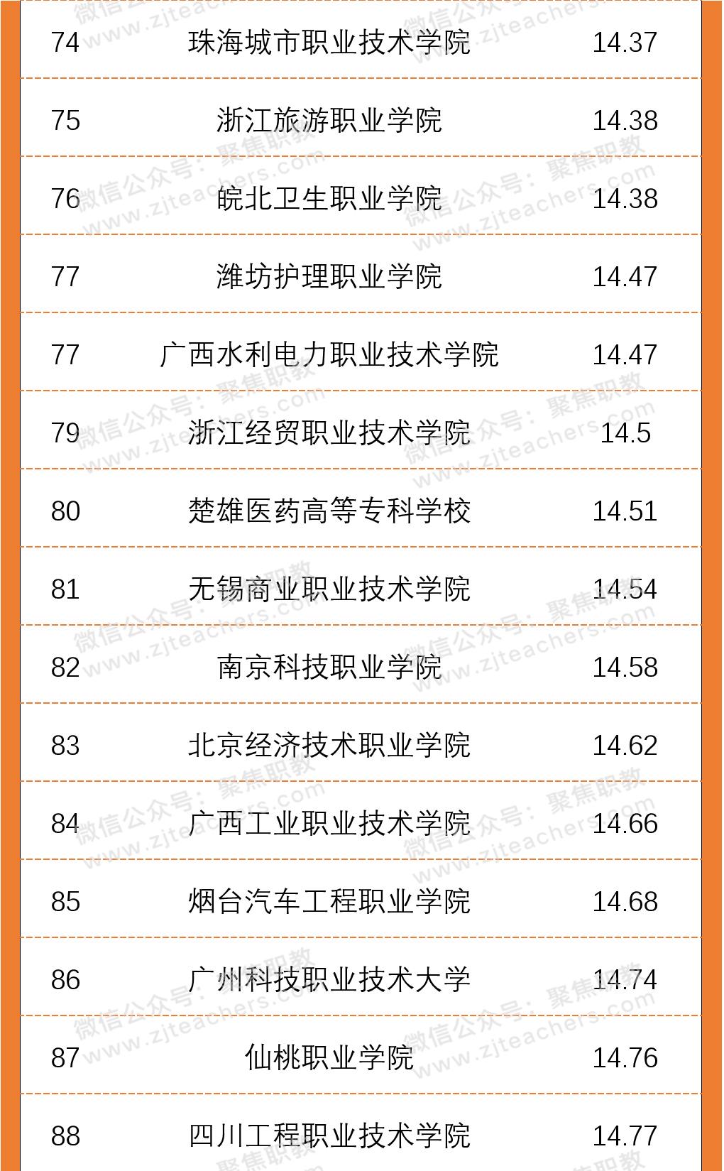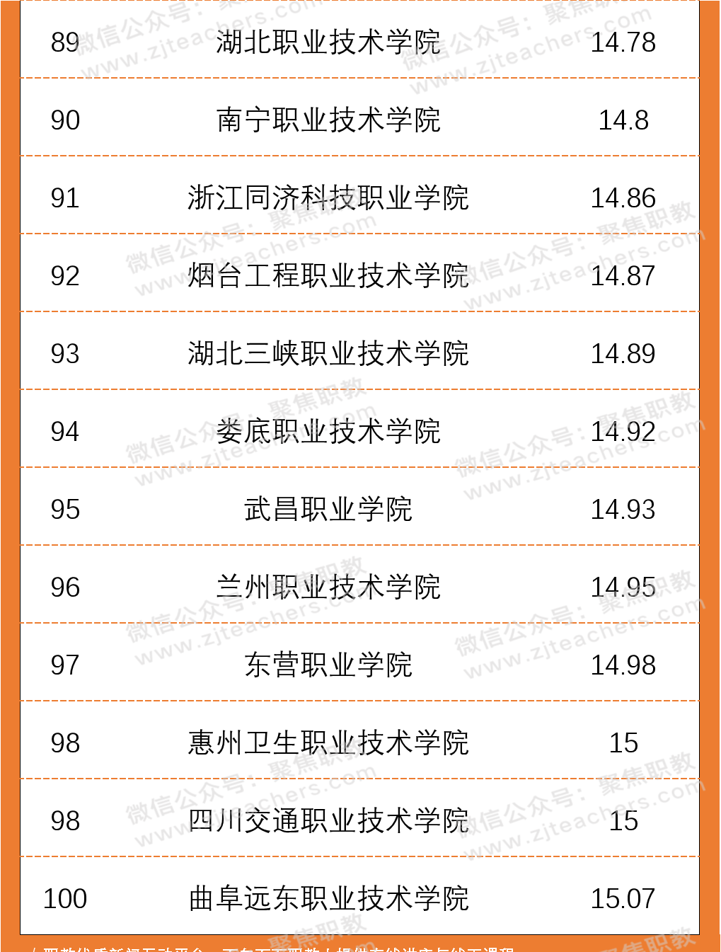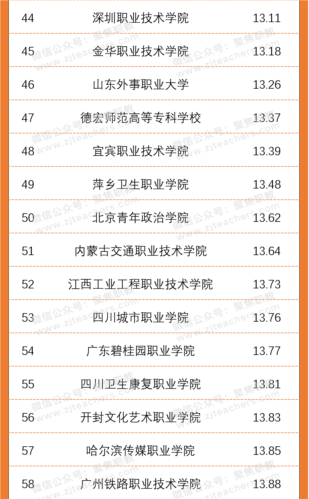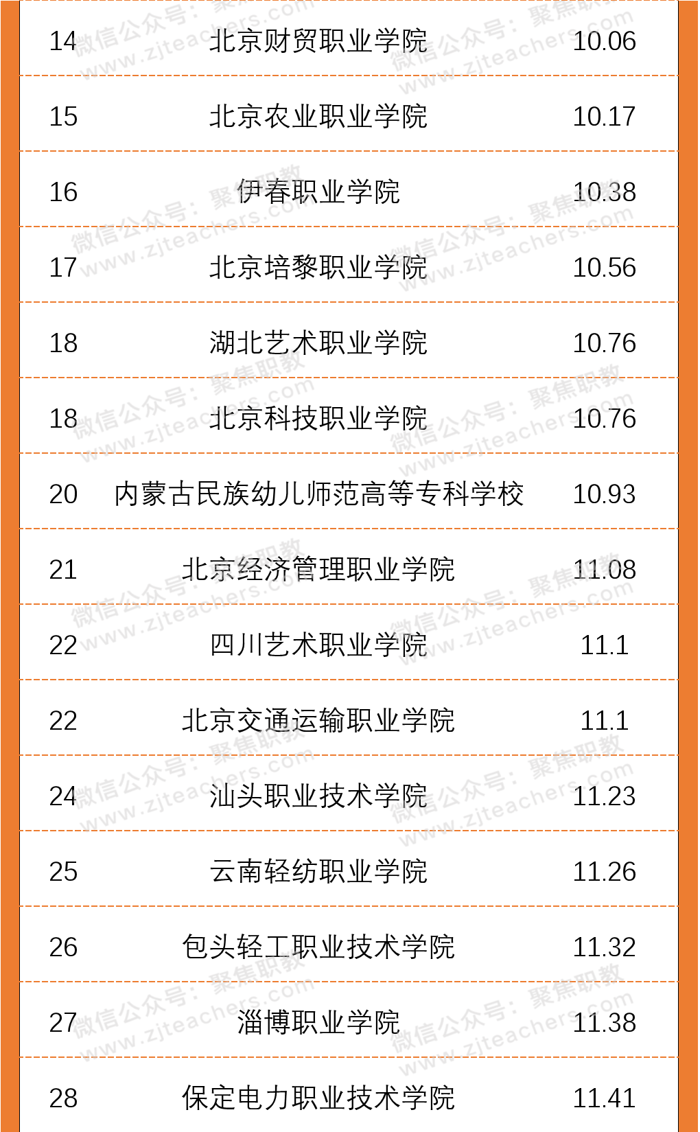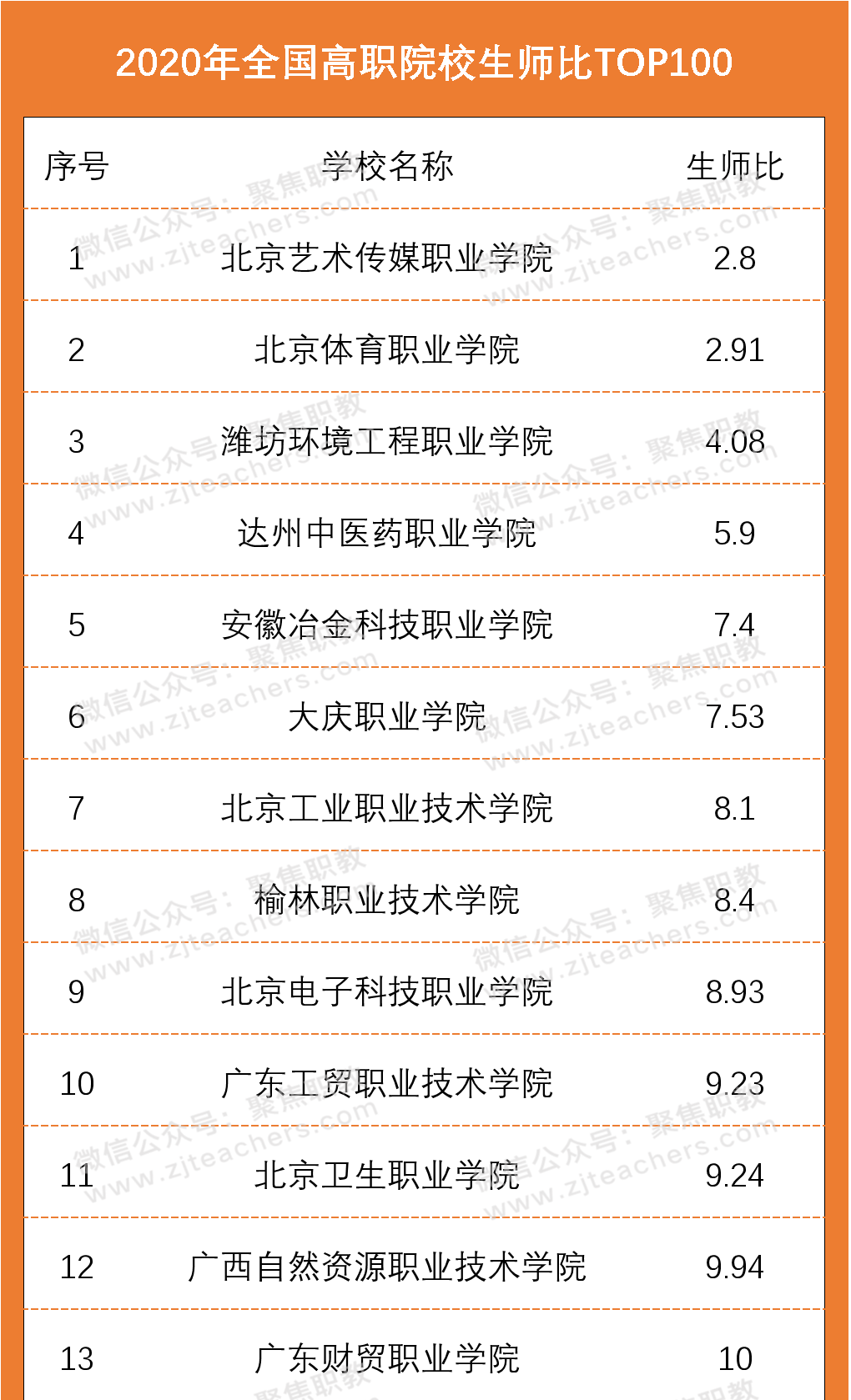 从2020年高职院校生师比百强名单上来看,北京艺术传媒职业学院以2.8的生师比排在首位,其次是北京体育职业学院生师比为2.91,排在第三位的是潍坊环境工程职业学院,生师比为4.08。值得一提的是,生师比前十名院校中,北京市高职院校就占据了四席;根据太阳成集团tyc印发的《普通高等学校基本办学条件指标(试行)》文件,生师比的合格标准为18:1,而在百强名单中,师生比均已达标且远低于这一比例,一定程度上代表着以上院校的学生可分配到的教学资源更多。