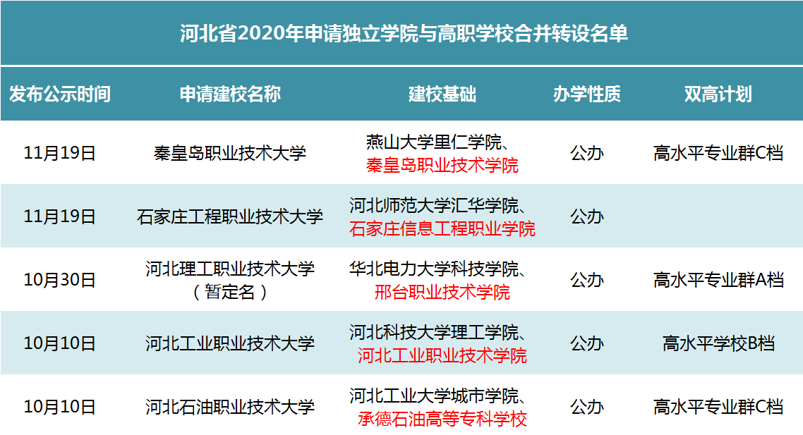 10月、11月,河北省连续三次发布“关于2020年高等学校设置事项的公示”,根据公示名单,有5所高职院校与独立学院合并转设为公办本科职业学校,其中4所为“双高”院校。