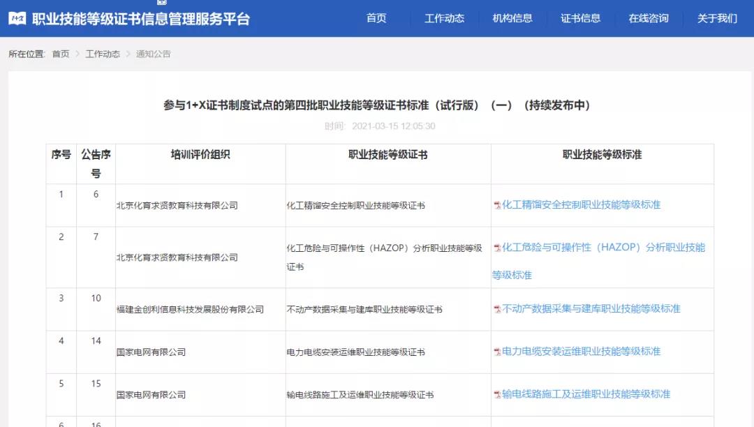 3月15日,职业技能等级证书信息管理服务中心发布“参与1+X证书制度试点的第四批职业技能等级证书标准(试行版)(一)”。