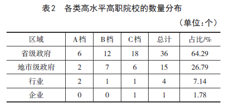 在56所高水平高职院校中,由省级政府举办的共有36所,占比64.29%。由地市级政府举办的共有15所占比26.79%。由行业和企业举办的高职院校较少,分别有4所和1所,占比7.14%和1.78%。其中有2所行业举办的高职院校被评为A档高水平院校。综上可见,省级政府举办的高职院校是推动我国高职教育质量发展改革的主力军。