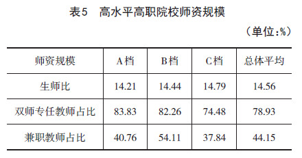 从师资规模来看,56所高水平高职院校平均生师比为14.56,平均双师素质专任教师占比达到了78.93%,平均兼职教师占比为44.15%。整体来看,师资队伍的数量与结构都较为合理。具体分析,A档高职院校的生师比值要小于B档和C档院校,双师素质专任教师占比高于B档和C档高职院校,说明A档高职院校师资队伍的数量与结构更为优异。而从兼职教师占比来看,B档高职院校要高于A档和C档高职院校(表5)。