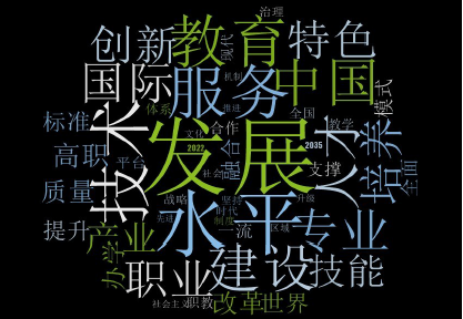 对申报文本进行词频统计分析,采用词汇云的形式可以直观地呈现出高水平高职院校建设目标。如图3所示,发展、水平、技术、服务、教育、建设、中国是建设目标的高频词,出现次数均超过200次。