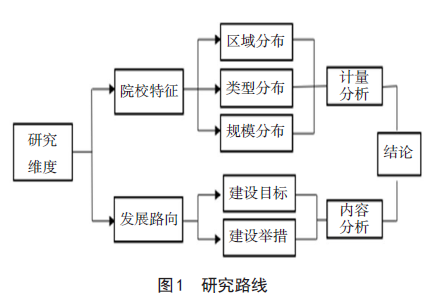 本研究以56所获评为高水平高职院校的申报书文本为研究对象,使用QSR Nvivo 11.0文本分析软件和SPSS 21.0 统计软件进行词汇和数据的挖掘,对数据文本以及话语内容进行分析,以此呈现高水平高职院校的样态特征,揭示其发展路向,以期为高水平高职院校建设提供借鉴参考。本研究的思路及技术路线如图1所示。