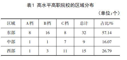 表1所示,高水平高职院校的区域分布不平衡性极其显著,东部地区无论从数量还是质量上都占有绝对优势。数量上看,东部地区高水平高职院校共有32所,占比57.14%。其次是西部地区共有高水平高职院校15所,占比26.79%。从质量上看,A档和B档高水平高职院校均以东部地区为主,都占比该层次的80%。而C档高水平高职院校以西部地区为主力,占比42.31%,其次仍然是东部地区,占比30.77%。