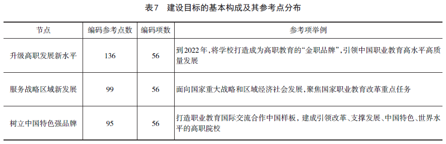 为深入分析其发展目标,首先采用自由编码形式将目标内容进行编码,形成多个节点;再借用归纳法,不断比较节点内容,将相似节点连接在一起形成主轴编码。研究发现,以提质增能为核心的内涵式发展是高水平高职院校未来的建设目标(表7),具体可以归为三点:其一,升级高职发展新水平;其二,服务战略区域新发展;其三,树立中国特色强品牌。