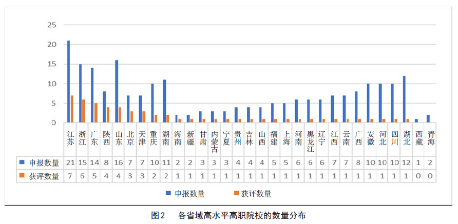 东部地区主要集中在江苏、浙江、广东、山东、北京5个省域,江苏省高水平高职院校数量位居全国榜首。中部地区主要集中在湖南。西部地区主要集中在陕西和重庆。黑龙江、辽宁、吉林、安徽、河北、山西、宁夏等20个省域的高水平高职院校仅有1所,而青海和西藏没有获评高水平高职院校。