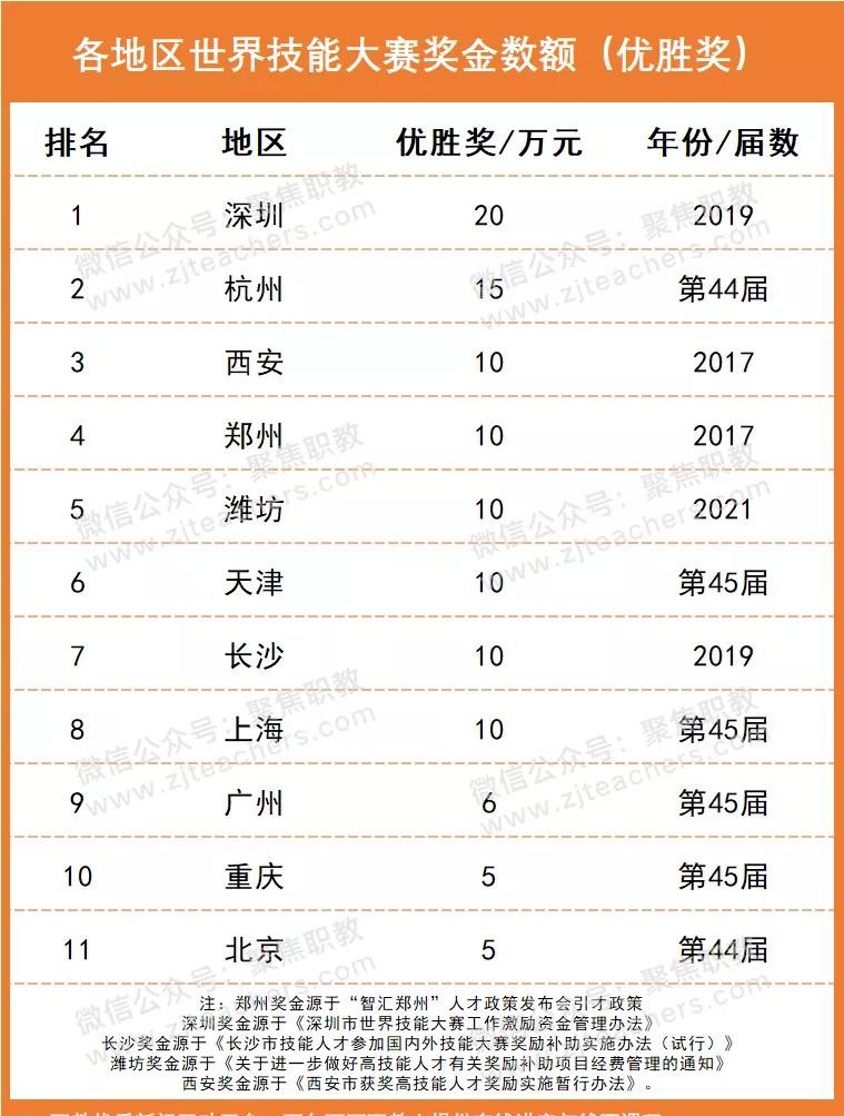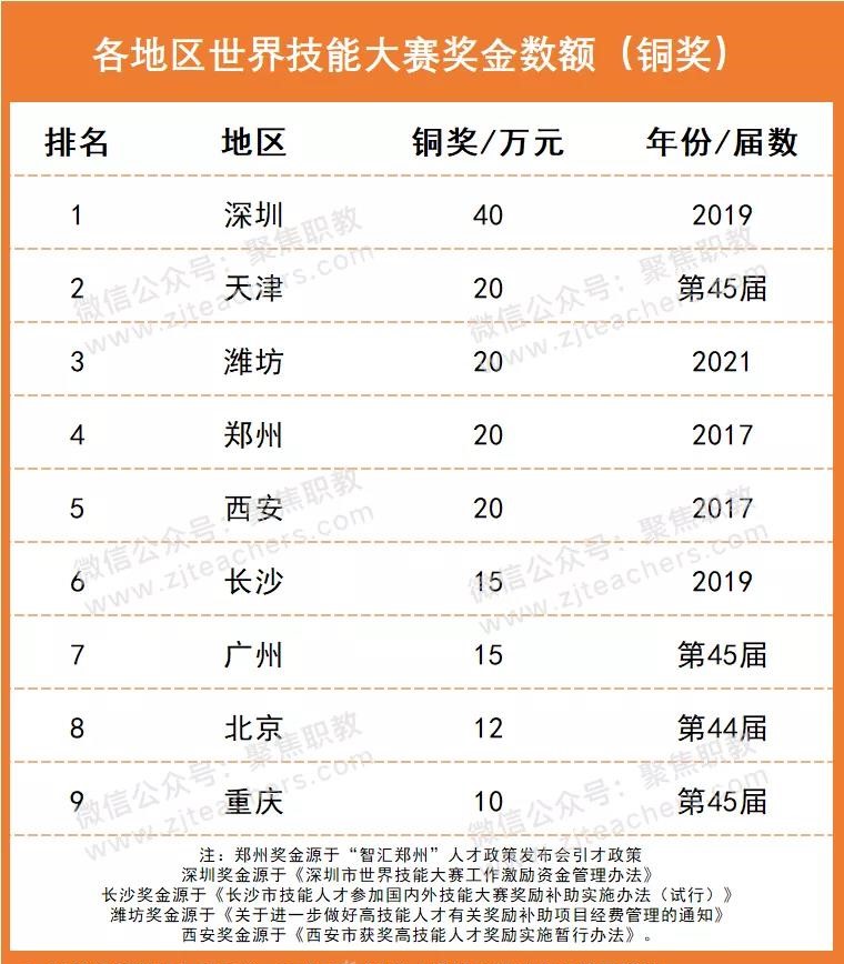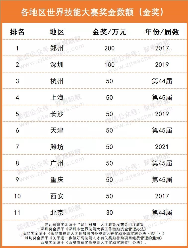 相较于省份,全国其他各市对世赛获奖选手的奖励政策更多更丰富,奖励金额数目也不小,有的城市奖励甚至高达百万。以下为聚宝统计的金奖、银奖、铜奖和优胜奖的奖金情况。