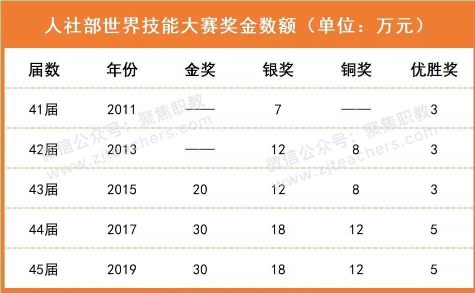 其中,金奖有10万元的涨幅,银奖从第41届到第45届有11万元的涨幅。其余奖项涨幅递减,铜奖增长幅度为4万元,优胜奖增长幅度为2万元。除了奖励金,获奖选手还会由其所在地省级人社部门晋升技师职业资格。