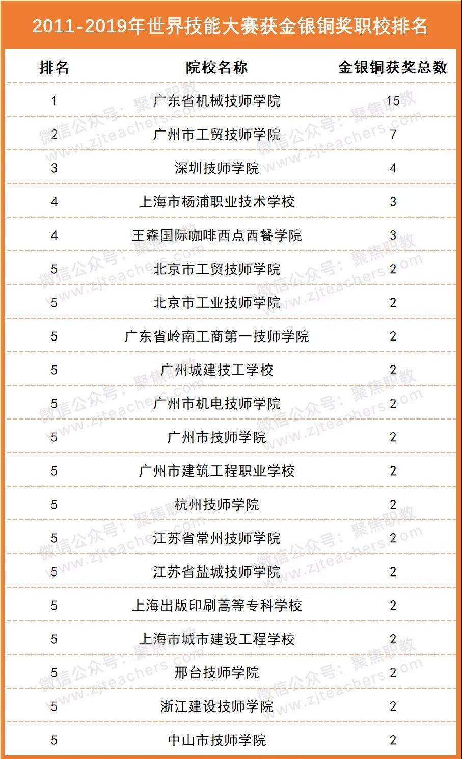 从排名可以看出,获得金银铜奖牌总数(按获奖牌人数统计)排名前三的是:第1名广东省机械技师学院、第2名广州市工贸技师学院、第3名深圳技师学院。广东省机械技师学院、广州市工贸技师学院、深圳技师学院、上海市杨浦职业技术学校、王森国际咖啡西点西餐学院这5所学校在世赛上都取得了不错的成绩。