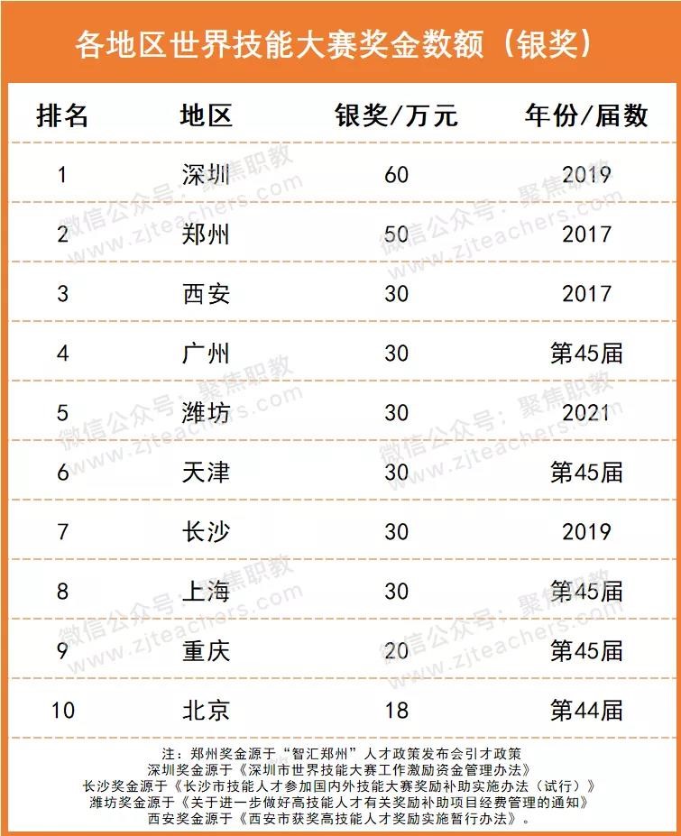 从上表可以看出,很多城市对银奖的奖金数额在30万左右,而唯有深圳拔得头筹,对本市获得世界技能大赛银奖的选手奖励60万元,是其他城市的2倍。其次是郑州,奖励本市世界技能大赛银奖获得者50万元。郑州和深圳不仅金奖奖金数额在全国领先,银奖奖金数额也是不相上下。有2个城市的奖金在30万元以下,重庆奖励20万元,北京奖励18万元。