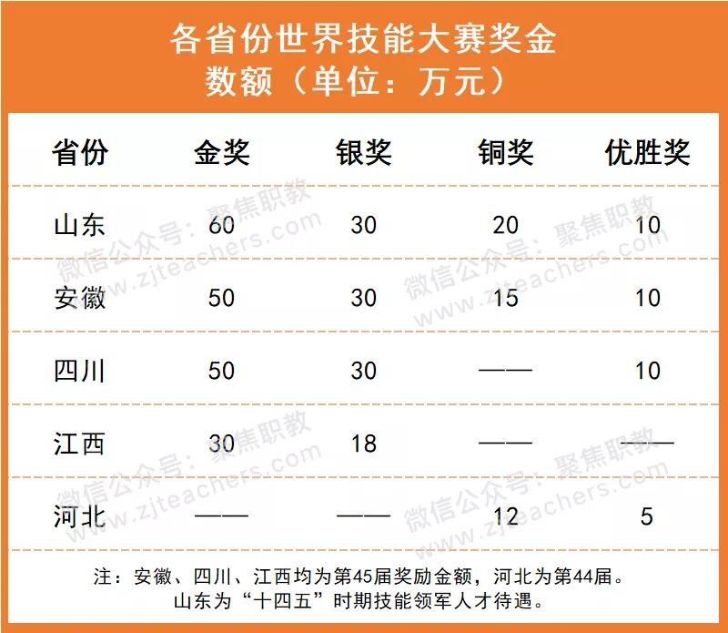 目前对本省世赛获奖选手有奖金鼓励的省份有山东、安徽、四川、江西和河北。五个省中,山东省奖励金额最高,对金银铜获奖选手分别奖励60万、30万、20万元,对优胜奖给予10万元奖励。安徽和四川对金银奖获奖选手奖励金额一样,金奖为50万元,银奖为30万元。