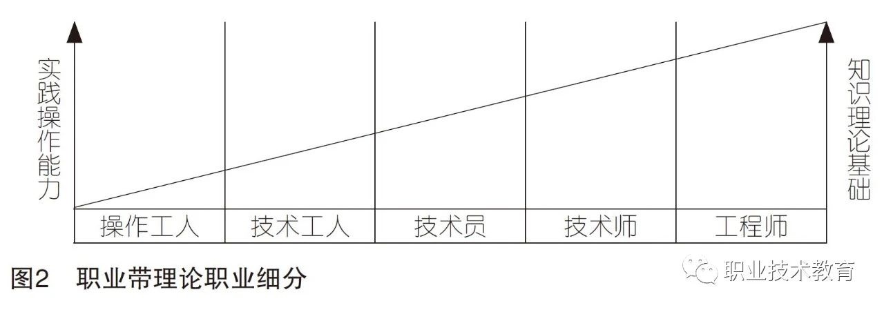 图2中将整个职业带的人才划分为操作工人、技术工人、技术员、技术师和工程师五种类型。与以往职业带理论三种人才类型的划分不同,增加了操作工人、技术师两种人才类型,同时原有的技术工人、技术员两种人才类型的内涵也有所变化。其中,操作工人能够按照相应的操作规程进行机械、设备的使用和操作,关注于生产实践工作中操作技能的熟练程度;技术工人与以往不同,需要具备一定的知识理论,但对实践操作技能有更高的要求,能够在工作实践中操作设备、使用工具的同时,进行一定的设备维护、调试等工作;技术员对知识理论基础和实践操作能力的要求比例相当,既要求具备较为扎实的知识理论基础,还应具有良好的实践操作技能,能够将所掌握的知识理论、技术技能进行熟练应用,从而适应生产实践一线的技术规程设计、工艺流程优化及设备设施维修和革新等工作;技术师则对知识理论的要求更高,需要具备扎实的知识理论基础及相应的实践操作技能,能够从事生产实践工作中的技术革新、工艺创新、管理决策、新技术研发与应用等工作;工程师则以知识理论基础为主,对实践操作技能的要求较弱,主要关注于工程技术中普遍性、规律性问题的创新与解决。从广义角度来看,操作工人、技术工人、技术员、技术师四种人才均对实践操作技能有一定的要求,可以认为这四种人才是职业教育人才培养的范畴,均可认为是技术技能型人才。从狭义角度来看,考察这四种人才对知识理论和实践操作能力的要求可知,操作工人和技术工人更为偏重实践操作能力的培养,因此,这两种人才可以归结为技能型人才;技术师则对知识理论基础更为关注,从而能够更好地以所学知识理论来指导生产实践,因此,技术师可以认为是技术型人才;技术员处于整个职业带的中间位置,要求知识理论和实践技能并重,既要有技能型人才所具备的生产实践一线设备、工具的操作技能,又需要具备良好的指导实践、技术应用的知识理论,因此,可以认为技术技能型人才是特指技术员。根据上述分析,结合我国职业教育发展实际,职业教育本科所培养的高层次技术技能型人才对应于职业带中的技术员,而操作工人可由中职学校进行培养,技术工人可由高职院校培养,技术师则可界定为职业教育本科院校所培养的硕士层次人才。