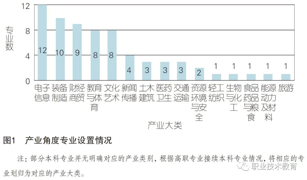 从产业类别角度来看,67个专业涉及15个产业大类,如图1所示。电子信息大类、装备制造大类、财经商贸大类、教育体育大类、文化艺术大类为开设专业最集中的产业类别,其中电子信息大类中的12个专业,集中于电子信息子类和计算机子类;对于装备制造大类,10个专业分属于自动化子类、汽车制造子类、机械设计制造子类和铁道通信信号设备制造与维护子类,而自动化子类和汽车制造子类则是装备制造大类中开设专业最为集中的子类别,分别为5个专业和3个专业;财经商贸大类中的9个专业涉及6个子类,分别为财务会计子类、电子商务子类、金融子类、经济贸易子类、市场营销子类、物流子类,该大类中的专业开设相对分散,反映出经济管理领域对职业教育本科人才需求的多样性;教育与体育大类的专业开设主要集中于语言子类、体育子类、教育子类,其中语言子类涉及5个专业,为该大类中开设专业最为集中的子类别;文化艺术大类共8个专业,主要涉及艺术设计和表演艺术两个子类,其中有6个专业为艺术设计子类专业;新闻传播大类中的4个专业分属于广播影视和新闻出版两个子类,其中广播影视子类包含3个专业;交通运输大类中的3个专业分属于水上运输和道路运输两个子类,水上运输子类则涉及2个专业;医药卫生大类、土木建筑大类均涉及3个专业,分属于3个不同的子类;资源环境与安全大类的两个专业分属于两个子类;其余产业大类均只有一个专业并对应于该大类下的专业子类。