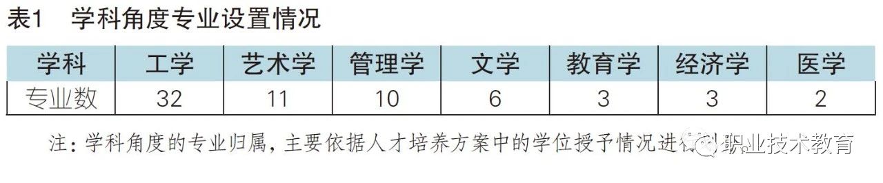 从学科角度来看,2020年15所试点高校的67个专业共涉及7个学科,考查专业特征和所属类别,67个专业均具有明显的应用性特征,每个学科对应开设的专业数量如表1所示。其中,工学32个专业涉及12种类别,主要集中于计算机类、机械类、自动化类和电子信息类;艺术学11个专业则涉及4种类别,设计学类是该学科开设专业最多的类别;管理学10个专业涉及6种类别,工商管理类为该学科开设专业数最多的类别;文学共6个专业涉及2种类别,专业开设主要集中于外国语言文学类;教育学和经济学均为3个专业,涉及2种类别,医学则包含2个专业,分别涉及2种类别。