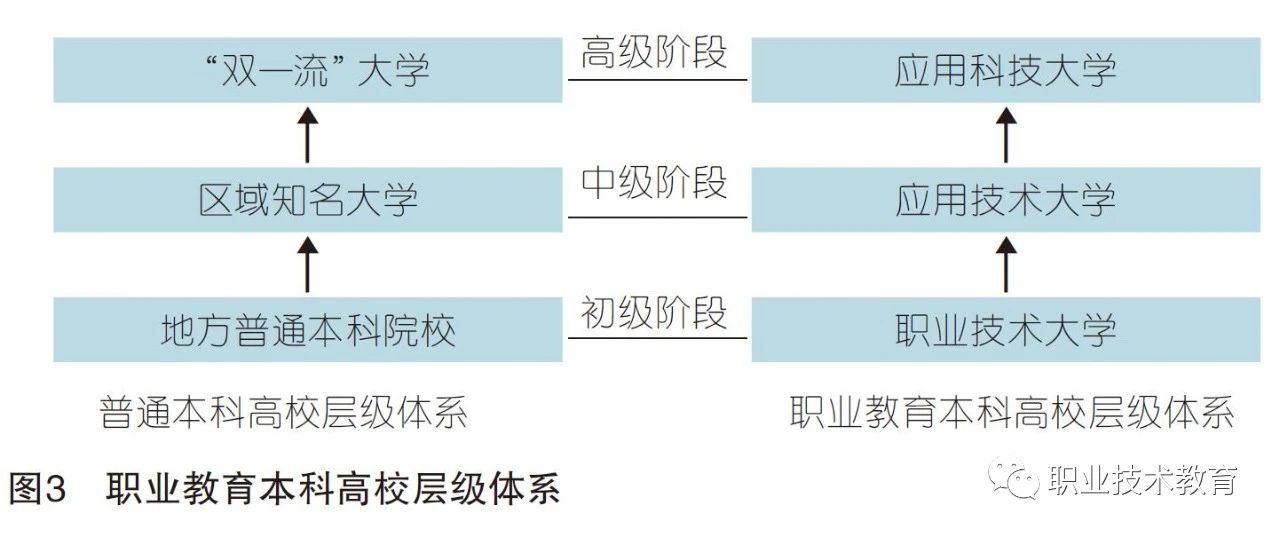 发展职业教育本科的必要性和可行性已在理论层面和实践层面达成了共识,而对于举办职业教育本科的院校而言,还存在发展目标和发展方向模糊的问题。在我国普通本科高等教育发展过程中,随着“211工程”“985工程”等高等教育发展战略的实施,已形成了较为清晰的普通本科院校层级体系。因此,可借鉴普通本科院校的发展经验,尽快建设一批职业教育本科示范,鼓励、扶持部分办学条件良好、办学成效突出的职业教育本科院校快速发展,成为职业教育本科发展的龙头,促进职业教育本科院校层级体系的形成。在实践中,可参照普通高等教育发展的经验,进一步规范职业教育本科院校的名称,建立由职业技术大学、应用技术大学、应用科技大学构成的三级职业教育本科院校层级体系。如图3所示,职业技术大学主要关注本科层次人才培养,应用技术大学则进行本科及专业硕士研究生培养,而应用科技大学则以专业硕士、博士研究生培养为重点,三级职业教育本科院校层级体系的建立,在形成职业教育本科院校人才培养梯队结构的同时,也反映了职业教育本科院校发展的不同阶段,为处于职业教育本科层级体系中的高校提供明确的发展目标,使其找准自身定位、确立发展方向,从而促进职业教育本科院校不断挖掘办学潜力,突出人才培养特色,提升办学成效。