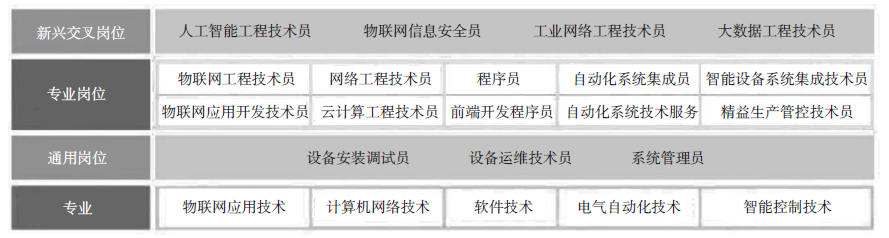 通过调研长三角及无锡地区40 家中小微智能制造与物联网技术企业,面向数字化车间设备智联、数字管控、互联互通、数据融合、数据智能等环节的高职毕业生所从事的就业主要岗位进行数据分析,提炼典型工作岗位,确定专业群的通用岗位、各专业的主要岗位和新兴复合交叉岗位(图2)。